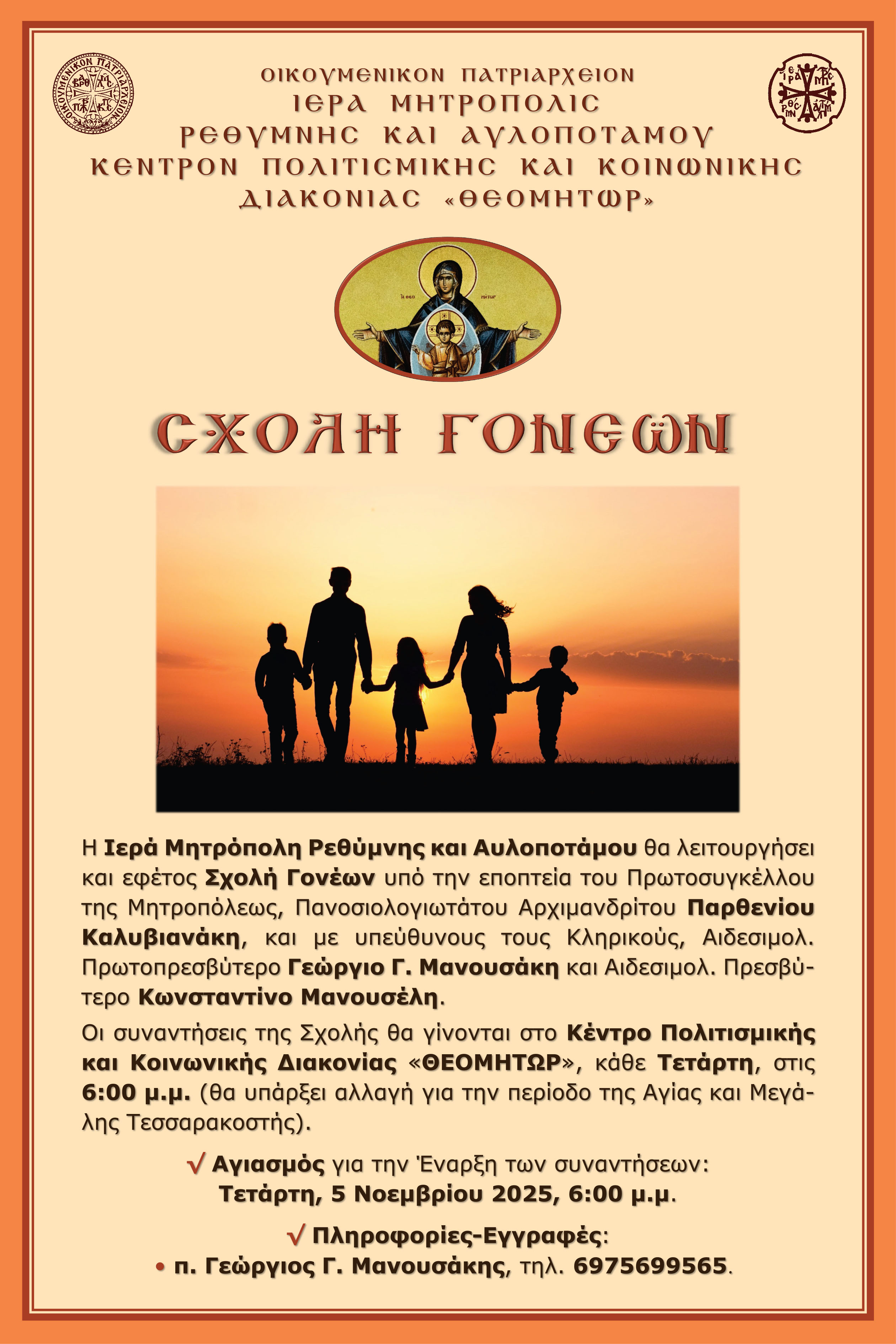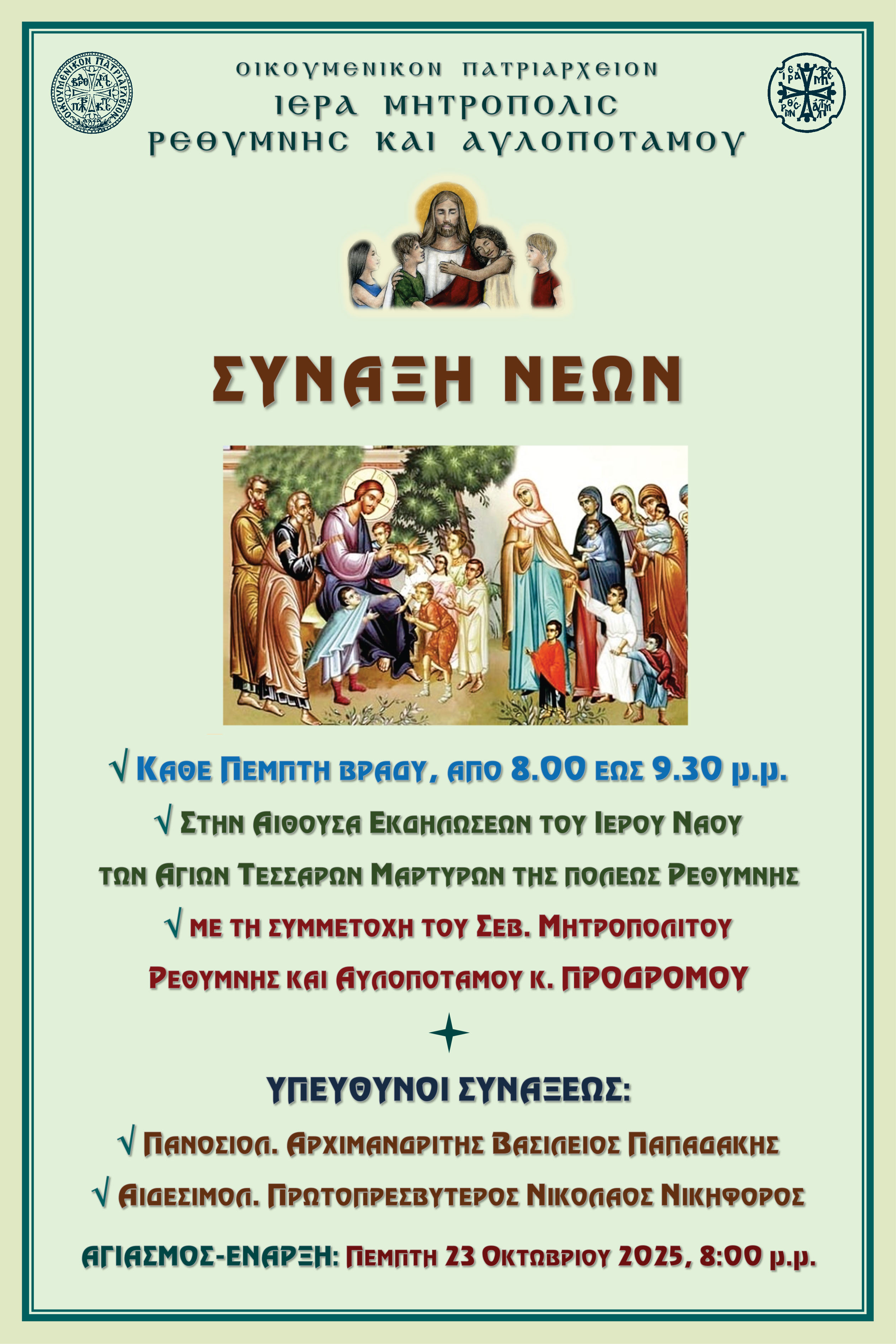 ΡΕΘΥΜΝΟ 07.10.2025 15:21Σχολή Γονέων, Σύναξη Νέων και Σχολές Αγιογραφίας και Ψηφιδωτού από την Μητρόπολη Ρεθύμνης και Αυλοποτάμου Ρέθεμνος Newsroom Facebook Twitter Copy link 0 Ξεκινούν και φέτος σειρά προγραμμάτων από την Ιερά Μητρόπολη Ρεθύμνης και Αυλοποτάμου.Ο Λόγος για την Σχολή Γονέων, στην Σύναξη Νέων και τις Σχολές Αγιογραφίας και Ψηφιδωτού. Λεπτομέρειες στις ανακοινώσεις που αναρτώνται: 0 Facebook Twitter Copy link ΣΧΕΤΙΚΑ ΑΡΘΡΑ Ρέθυμνο 16.12.2025 15:15Με την τέλεση αγιασμού παραδίδεται και επισήμως από την Κοινωνική Υπηρεσία του Δημου Ρεθύμνης, η "Γωνια θηλασμού" σε όλες τις νέες μητέρες Ρέθυμνο 16.12.2025 15:11Επίσκεψη της Προέδρου του Σ.Ε.Γ.Α.Σ. κ. Σοφίας Σακοράφα στα Ανώγεια - Προοπτικές συνεργασίας για την ανάπτυξη του κλασικού αθλητισμού Ρέθυμνο 16.12.2025 13:56Ρέθυμνο: Κλειστός για μια ώρα από τους αγρότες ο Κόμβος Αμαρίου Ρέθυμνο 16.12.2025 12:25Ο Εμπορικός Σύλλογος Ρεθύμνουυ στηρίζει τις κινητοποιήσεις των αγροτών