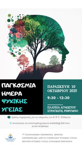 Στο πλαίσιο της Παγκόσμιας Ημέρας Ψυχικής Υγείας 2025, το Κέντρο Ψυχικής Υγείας Ενηλίκων Ρεθύμνου θα πραγματοποιήσει δράση ενημέρωσης για τις υπηρεσίες του Κέντρου την Παρασκευή 10 Οκτωβρίου 2025, στο Ρέθυμνο, Πλατεία Αγνώστου Στρατιώτη, 9:30’ – 12:30’. Κατά τη διάρκεια της δράσης υπάρχει δυνατότητα να δοθούν αυτοσυμπληρούμενα screening test στον γενικό πληθυσμό.