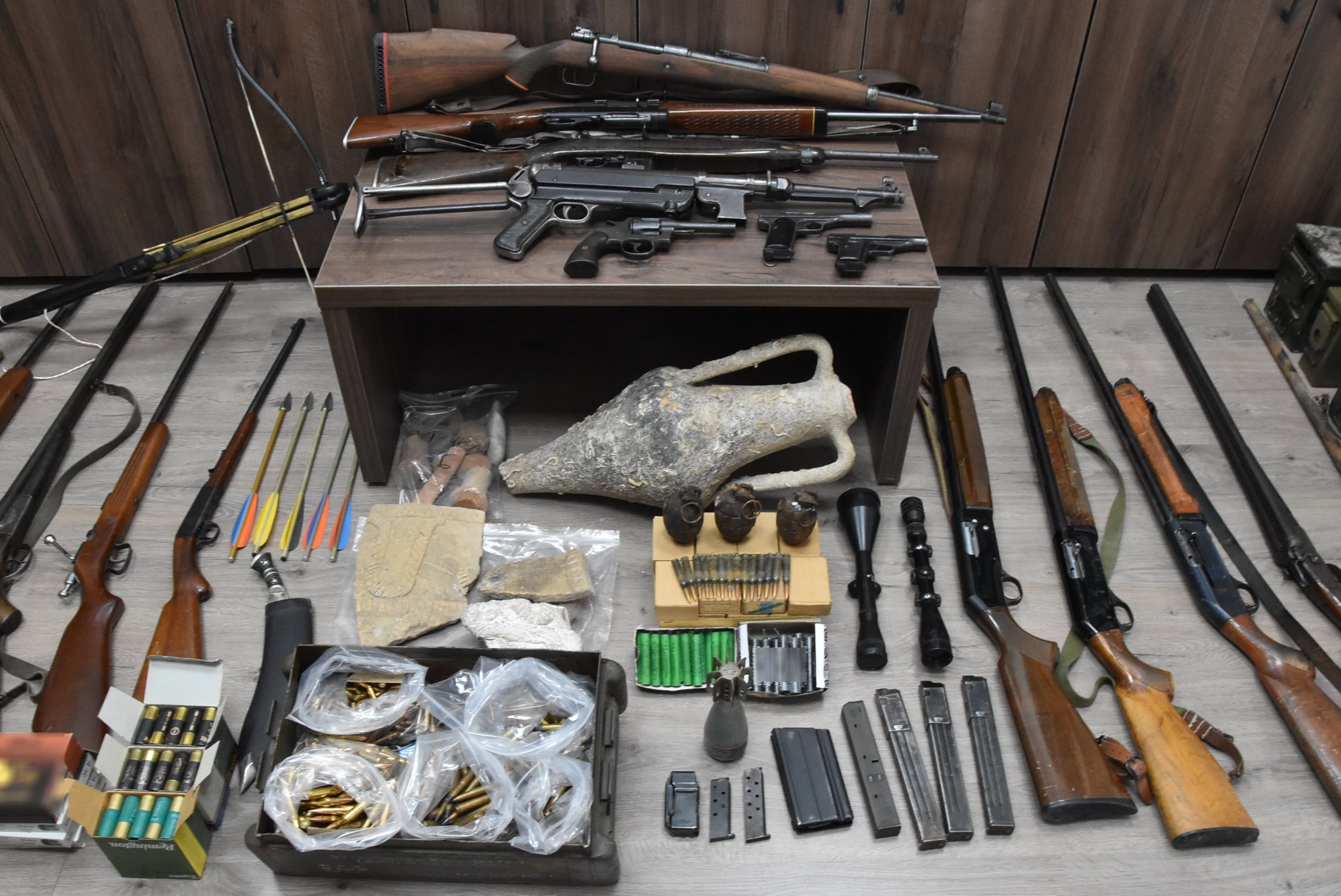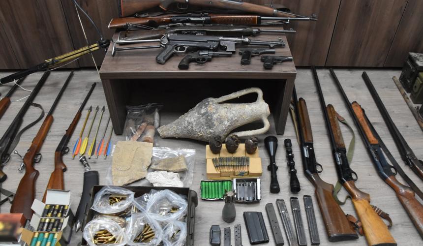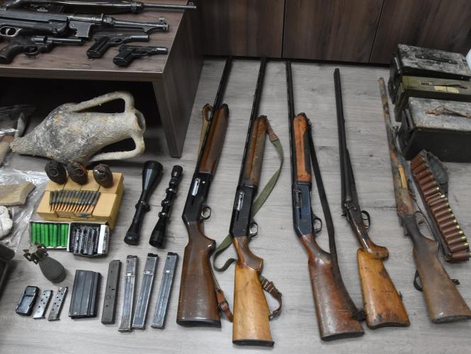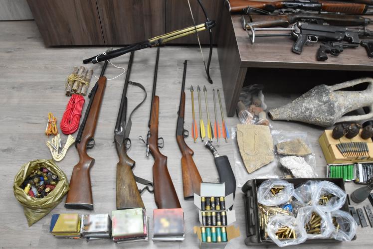 Βρέθηκαν και κατασχεθήκαν μεταξύ άλλων -16- όπλα,- 12- γεμιστήρες, -2.000- φυσίγγια, -3- χειροβομβίδες, ποσότητα ζελατοδιναμίοτιδας, -6- δυναμίτες και -14- πυροκροτητές