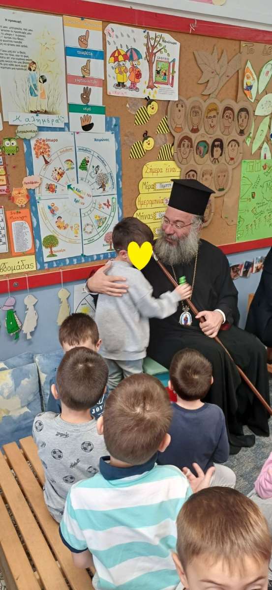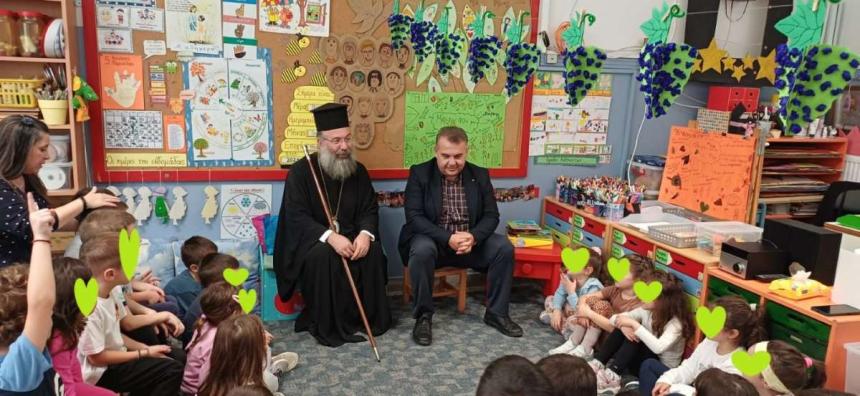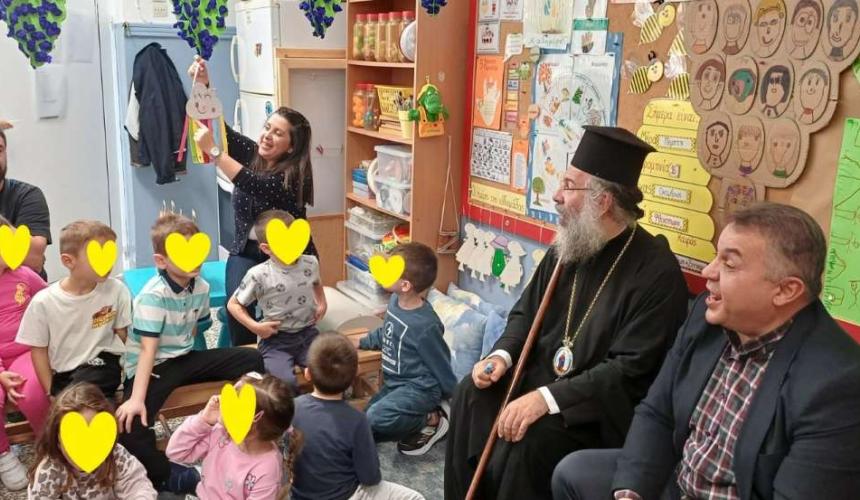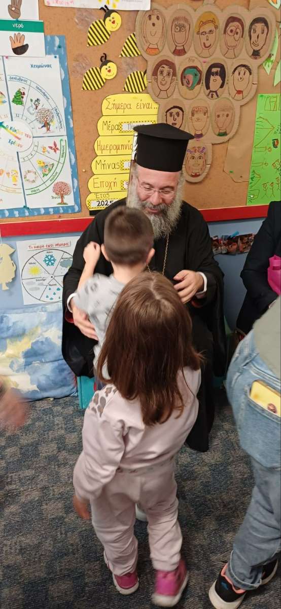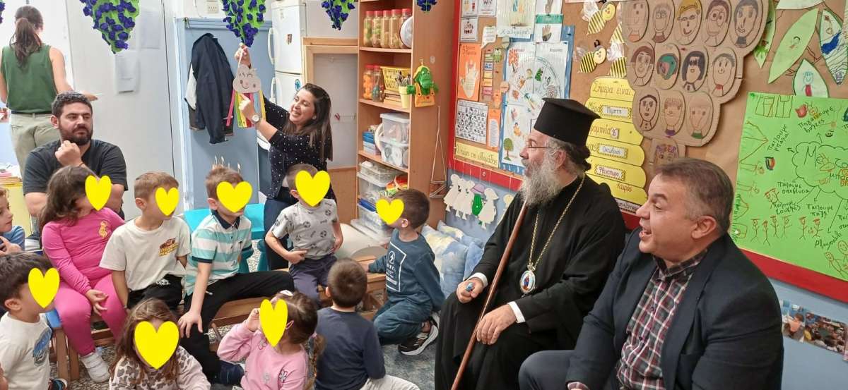 Τον Σεβασμιώτατο υποδέχθηκαν με μεγάλη χαρά οι μαθήτριες, οι μαθητές και οι εκπαιδευτικοί του Νηπιαγωγείου, με την παρουσία και του κ. Νεκτάριου Παπαδογιάννη, Αντιδημάρχου Παιδείας, Νέας Γενιάς και Δια Βίου Μάθησης του Δήμου Ρεθύμνης.