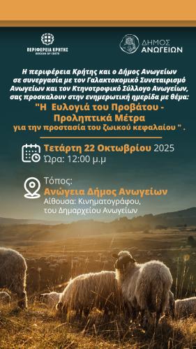 Η Περιφέρεια Κρήτης, με αίσθημα ευθύνης για την προστασία του ζωικού κεφαλαίου του νησιού, διοργανώνει ενημερωτική ημερίδα με θέμα: «Η Ευλογιά του Προβάτου – Προληπτικά Μέτρα για την Προστασία του Ζωικού Κεφαλαίου».