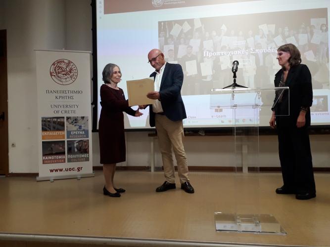 Ακολούθησε η ανάγνωση του τιμητικού διπλώματος από την Πρόεδρο του Τμήματος Καθηγήτρια Χρ. Καρακιουλάφη και η απονομή του από τον Πρύτανη Καθηγητή Γ. Κοντάκη.