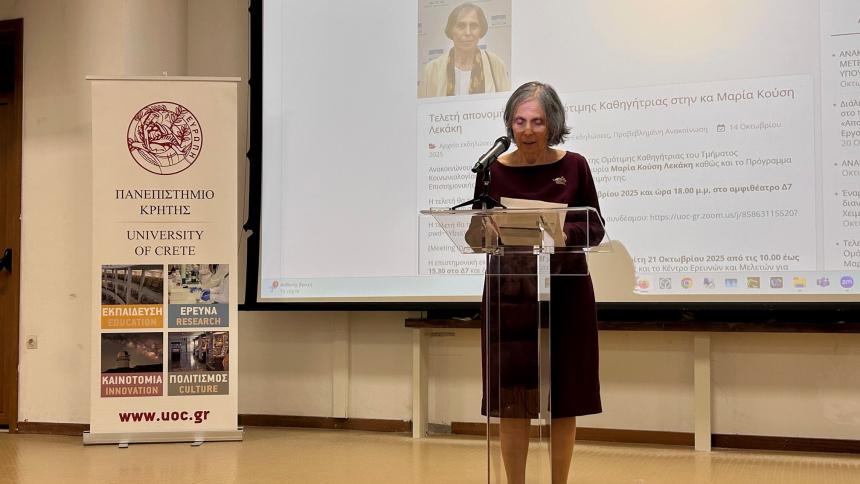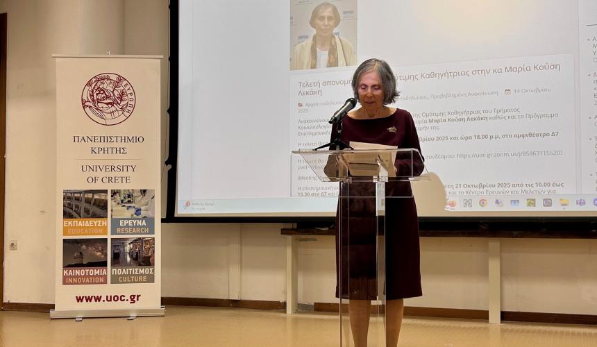 Σε κλίμα βαθιάς συγκίνησης, θερμής αναγνώρισης και εκτίμησης της προσωπικότητας και του έργου της Καθηγήτριας Μαρίας Κούση Λεκάκη, το Πανεπιστήμιο Κρήτης και το Τμήμα Κοινωνιολογίας της απένειμαν τον τίτλο της Ομότιμης Καθηγήτριας του Τμήματος Κοινωνιολογίας του Πανεπιστημίου Κρήτης. Η τελετή πραγματοποιήθηκε χθες, Δευτέρα 20 Οκτωβρίου 2025 ώρα 18:00 μ.μ., στο αμφιθέατρο Δ7 στην Πανεπιστημιούπολη Ρεθύμνου, παρουσία του Πρύτανη του Ιδρύματος Καθηγητή Γεώργιου Κοντάκη, του Αντιπρύτανη Καθηγητή Γεώργιου Σταματόπουλου και του Κοσμήτορα της Σχολής Κοινωνικών Επιστημών Καθηγητή Νικόλαου Βαφέα, μελών της πανεπιστημιακής κοινότητας, συγγενών, φίλων και συναδέλφων της τιμώμενης.