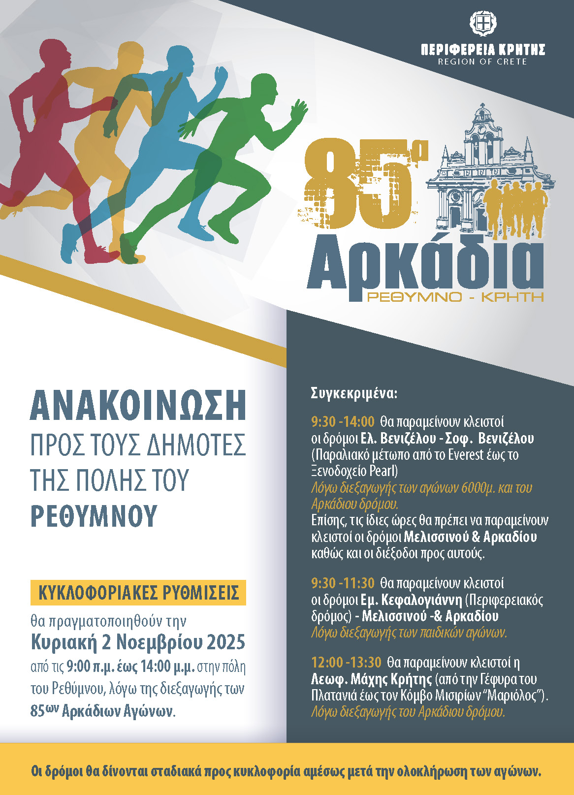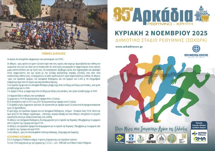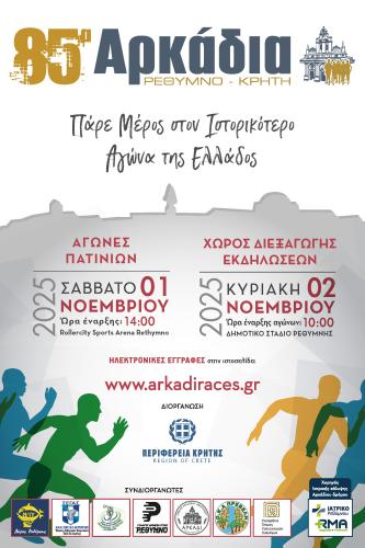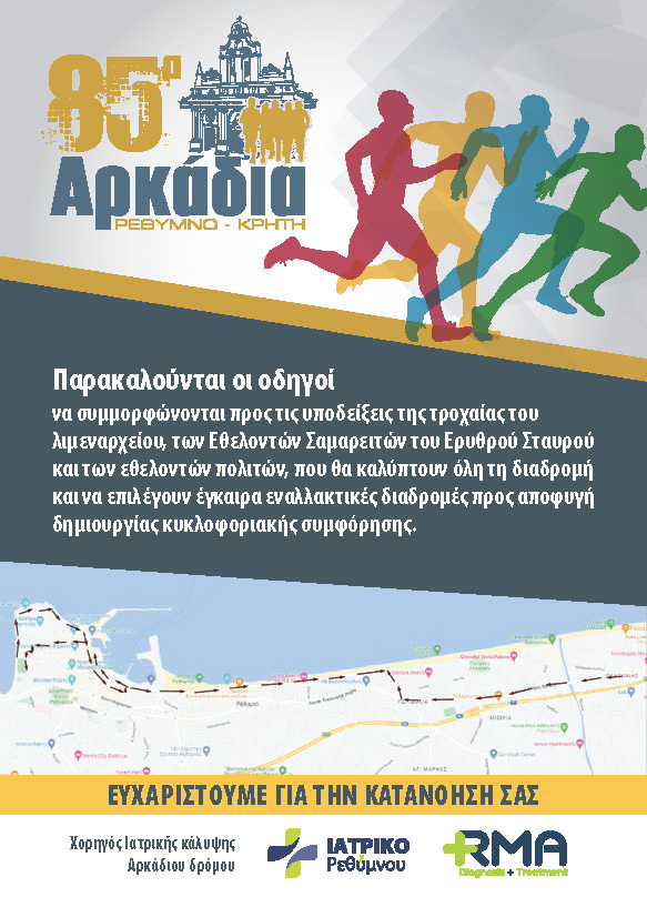 11:30 Εκκίνηση Αρκάδιου Δρόμου Ανδρών - Γυναικών από την Ι.Μ. Αρκαδίου και τερματισμό στο Δημοτικό Στάδιο Ρεθύμνης (Σοχώρα).