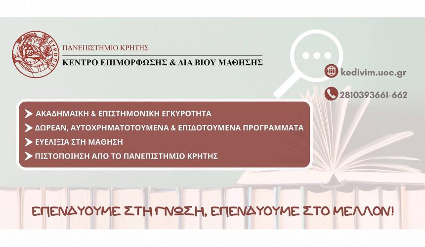 Η Περιφέρεια Κρήτης και το Κέντρο Επιμόρφωσης και Διά Βίου Μάθησης του Πανεπιστημίου Κρήτης (ΚΕΔΙΒΙΜ-ΠΚ), σε συνεργασία με το Κέντρο Πολιτικής Έρευνας & Τεκμηρίωσης (ΚΕΠΕΤ) του Τμήματος Πολιτικής Επιστήμης του Πανεπιστημίου Κρήτης & τη Μονάδα Ερευνών Αγοράς & Επιχειρηματικότητας (ΕMRUn) του Πανεπιστημίου Κρήτης, διοργανώνουν το, μεγάλης κλίμακος, «Επιμορφωτικό Πρόγραμμα για νέους/ες σε μειονεκτικές περιοχές και κοινωνικές ευάλωτες ομάδες (επιχειρηματικότητα-απασχολησιμότητα- κατάρτιση-κοινωνική καινοτομία)».