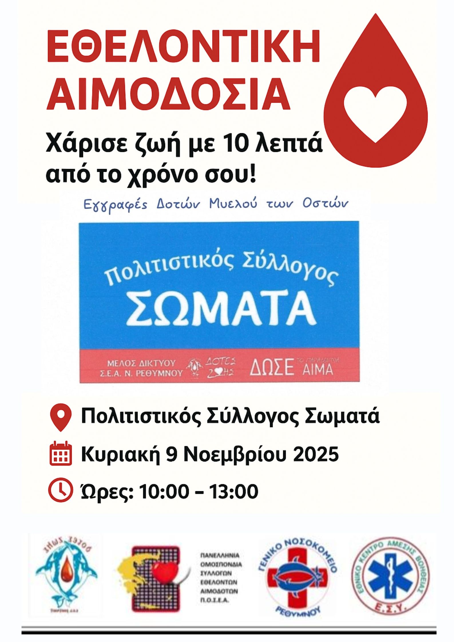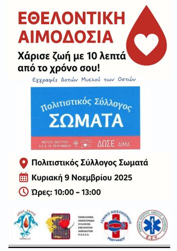 Ο Πολιτιστικός Σύλλογος Σωματά, σε συνεργασία με τον Σύλλογο Εθελοντών Αιμοδοτών Ν. Ρεθύμνου – ΔΟΤΕΣ ΖΩΗΣ, το Τμήμα Αιμοδοσίας του Γενικού Νοσοκομείου Ρεθύμνου και το ΕΚΑΒ, σας προσκαλεί να συμμετάσχετε στην επόμενη Εθελοντική Αιμοδοσία.