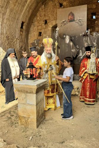 Μετά το πέρας της Θείας Λειτουργίας, άπαντες μετέβησαν στην Πυριτιδαποθήκη της Μονής, όπου τελέσθηκε Επιμνημόσυνη Δέηση και ακολούθως ο Σεβασμιώτατος άναψε τη δάδα της μικρής Κυριακής, μαθήτριας του εν λόγω Σχολείου, με την άσβεστη φλόγα του Αρκαδίου.