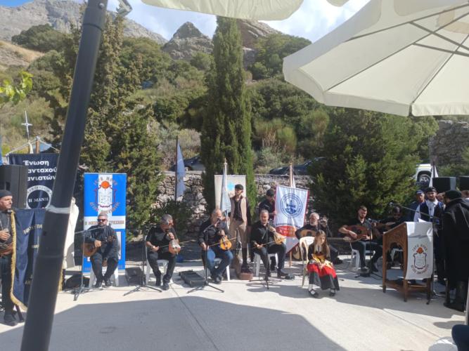 Συμμετείχαν με ριζίτικο τραγούδι ο Παραδοσιακός Σύλλογος «Ετεοκρήτες» , το Σώμα Αποδόσεως Τιμών του Δήμου Ανατολικής Μάνης και ο Σύλλογος των Απανταχού Μανιατών η Μάνη με την πρόεδρο της κ. Δήμητρα Κούβαρη, ο Παραδοσιακός Σύλλογος «Ακρητες», ο Λαογραφικός Όμιλος Τζανιδάκη , Ο Λαογραφικός Όμιλος Χοροκρητες, ο Λαογραφικός Όμιλος Λάζαρος και Μανώλης Χνάρης, ο Παραδοσιακός Σύλλογος «τα Πυρρίχια δρώμενα» και ο Σύλλογος Αναβιωτων Ρεθύμνου Φρουρά Μονής Αρκαδίου.