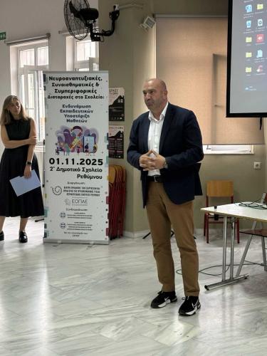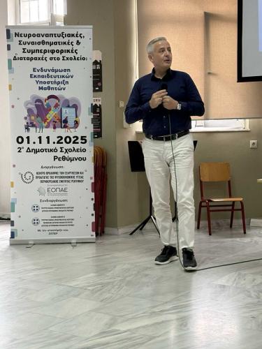 Πιο συγκεκριμένα, ο κ. Σαμιωτάκης, στην ομιλία του με τίτλο «Νευροαναπτυξιακές Διαταραχές: Αναγνώριση και Αντιμετώπιση στο Σχολικό Πλαίσιο» εστίασε στην κατανόηση των νευροαναπτυξιακών διαταραχών που συναντώνται συχνά στο σχολείο, όπως η ΔΕΠ-Υ, ο αυτισμός και οι μαθησιακές δυσκολίες. Μέσα από πρακτικά παραδείγματα και απλές στρατηγικές, αναδείχθηκε ο ρόλος του εκπαιδευτικού στην έγκαιρη αναγνώριση, την παραπομπή και τη δημιουργία ενός υποστηρικτικού μαθησιακού περιβάλλοντος για όλους τους μαθητές. Στη συνέχεια, η κ. Ψαθάκη στην ομιλία της με τίτλο « Συναισθηματικές & Συμπεριφορικές Δυσκολίες στην Τάξη: ο ρόλος του Εκπαιδευτικού,» αναφέρθηκε στις συναισθηματικές και συμπεριφορικές δυσκολίες των μαθητών και ανέδειξε το ρόλο των εκπαιδευτικών στην διαχείρισή αυτών των δυσκολιών μέσα στο σχολικό πλαίσιο. Τέλος, η Επιστημονικά Υπεύθυνη του Κέντρου Πρόληψης Π.Ε. Ρεθύμνου, κα Μπογά Ανδρονίκη, παρουσίασε τις δράσεις και τα προγράμματα υποστήριξης που προσφέρει το Κέντρο Πρόληψης Π.Ε. Ρεθύμνου για την ευαισθητοποίηση και εκπαίδευση των γονέων, των μαθητών και των εκπαιδευτικών Πρωτοβάθμιας και Δευτεροβάθμιας Εκπαίδευσης Ρεθύμνου.