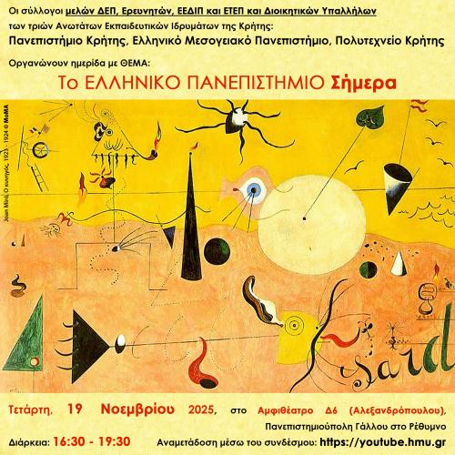 Οι Σύλλογοι μελών ΔΕΠ, ΕΔΙΠ, ΕΤΕΠ, Διοικητικών Υπαλλήλων και εργαζόμενων στην Έρευνα των τριών Ανώτατων Εκπαιδευτικών Ιδρυμάτων της Κρήτης — Πανεπιστήμιο Κρήτης, Ελληνικό Μεσογειακό Πανεπιστήμιο και Πολυτεχνείο Κρήτης — διοργανώνουν ανοιχτή ημερίδα με θέμα: