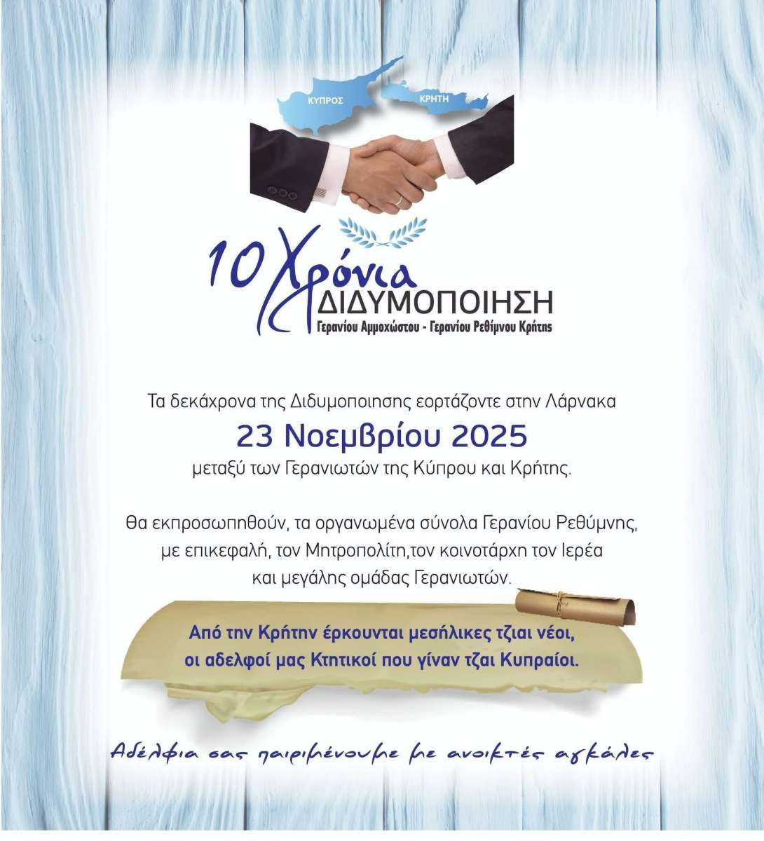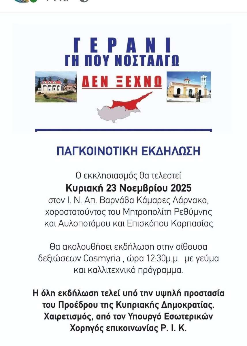Κατόπιν σχετικής προσκλήσεως του Μακαριωτάτου Αρχιεπισκόπου Κύπρου κ.κ. ΓΕΩΡΓΙΟΥ, καθώς και των Κοινοτήτων του Γερανίου Καρπασίας Κύπρου και του Γερανίου Ρεθύμνης, ο Σεβασμιώτατος Μητροπολίτης Ρεθύμνης και Αυλοποτάμου κ. Πρόδρομος θα μεταβεί, συν Θεώ, στη Μεγαλόνησο Κύπρο, κατά το διήμερο 22 και 23 Νοεμβρίου 2025, προκειμένου να μετάσχει στους επετειακούς εορτασμούς για τη συμπλήρωση 10 ετών από την αδελφοποίηση των δύο εν λόγω Κοινοτήτων.