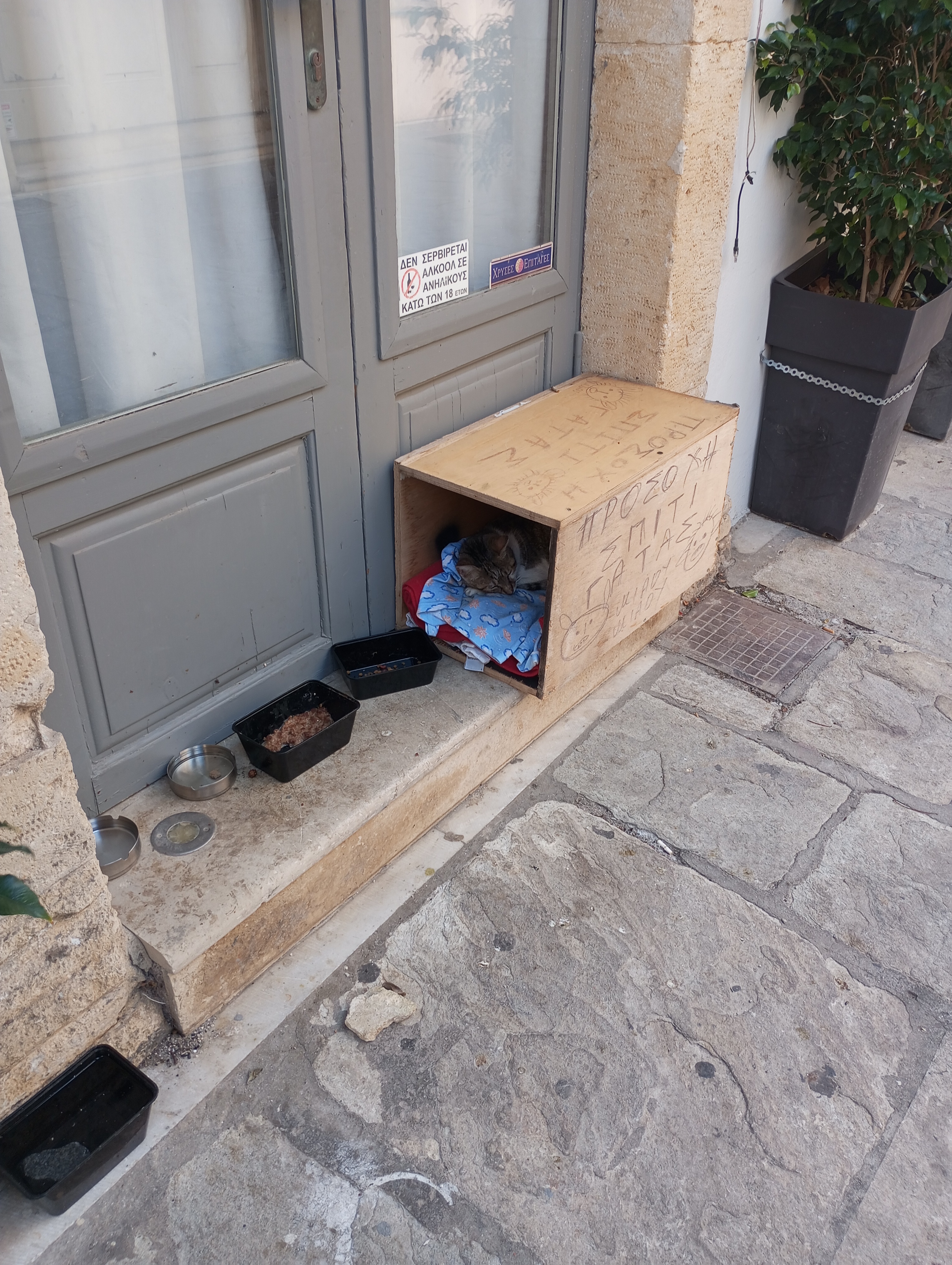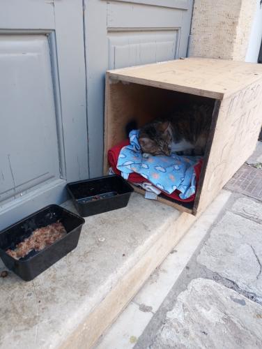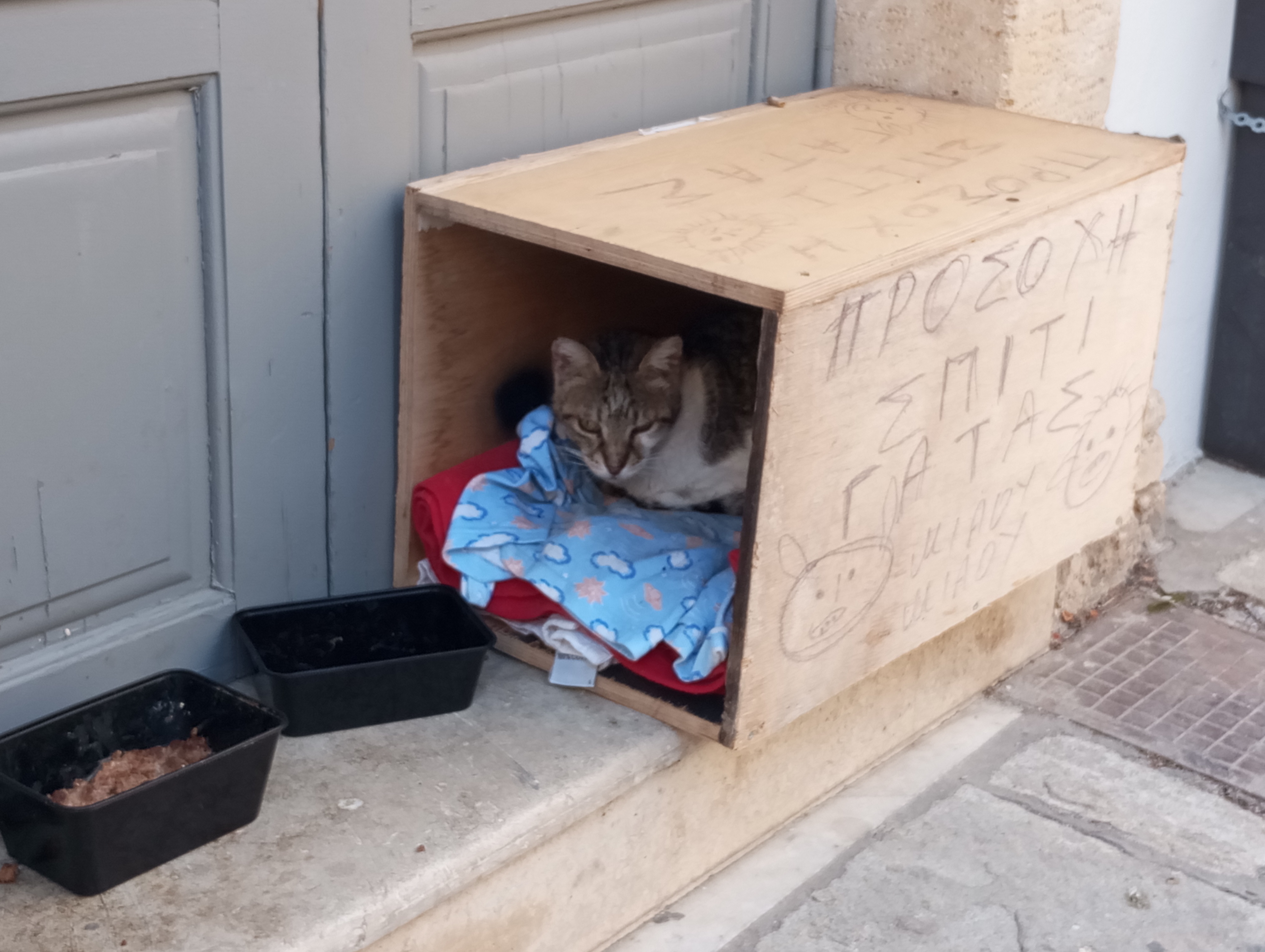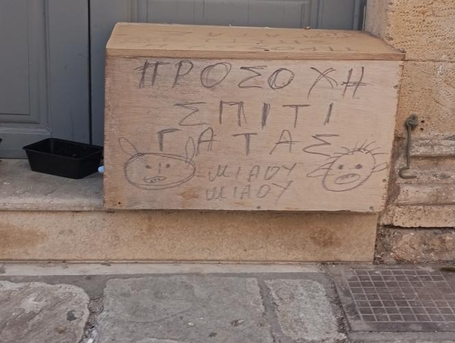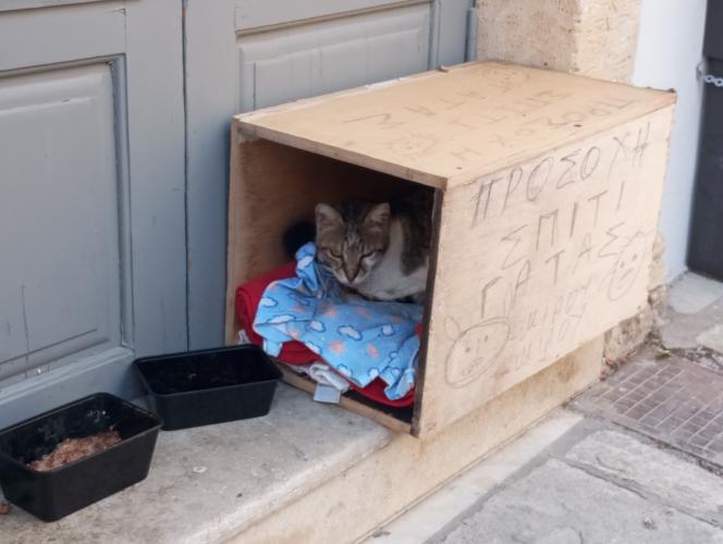 «Προσοχή! Σπίτι Γάτας! Νιάου – νιάου» γράφει το ξύλινο σπιτάκι της γατούλας που βρήκε μια ζεστή γωνιά για να νιώσει ασφάλεια στην οδό Βερνάρδου της παλιάς πόλης απέναντι από το Σπίτι Πολιτισμού.