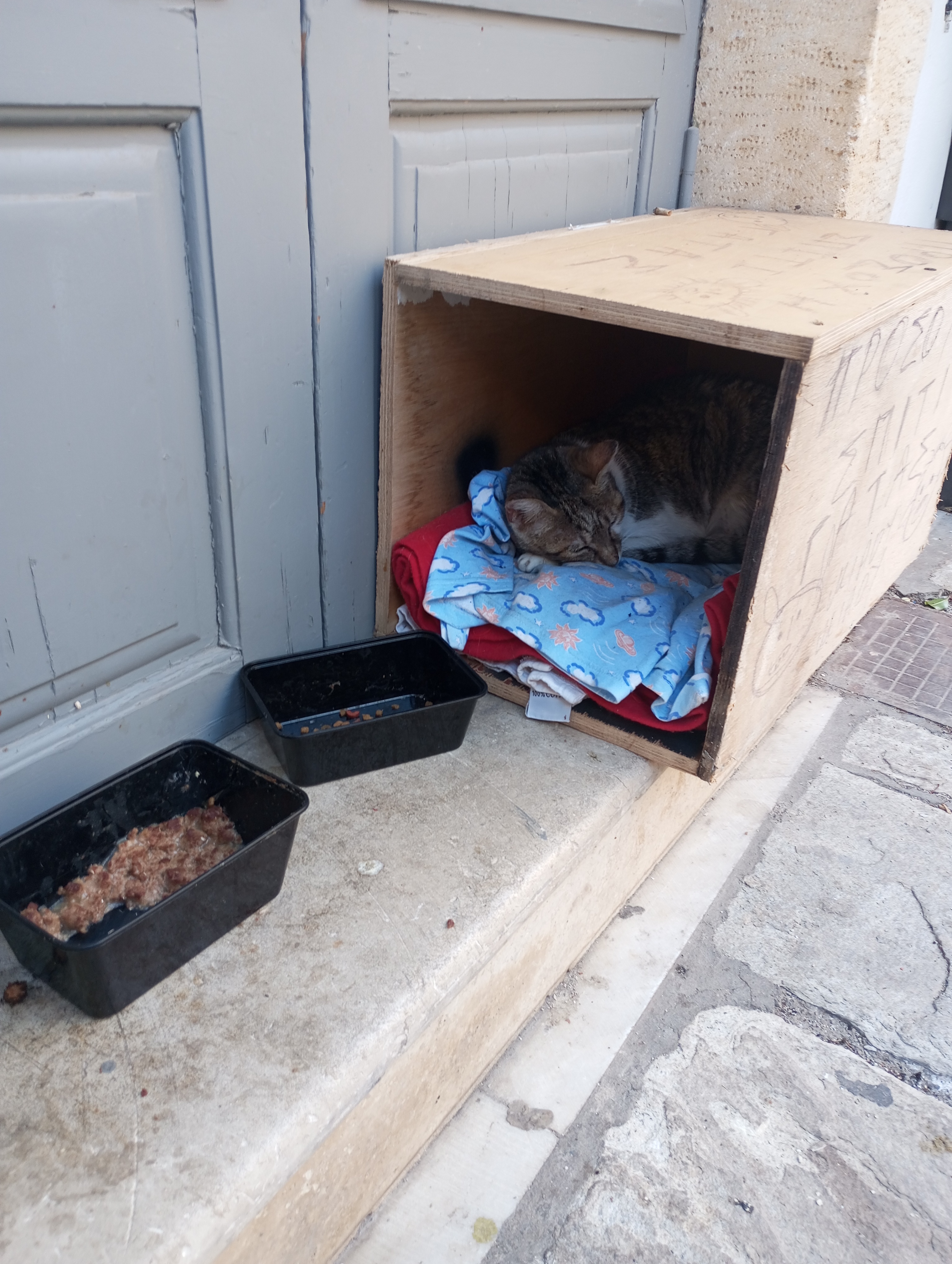 Ένα όμορφο προστατευτικό κουτάκι, ένα ζεστό ρούχο μέσα σε αυτό, λίγο φαγητό και νεράκι.