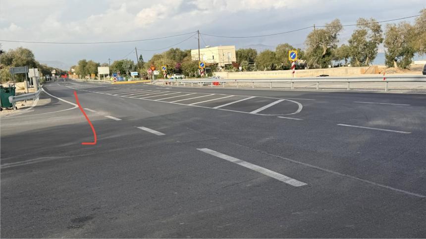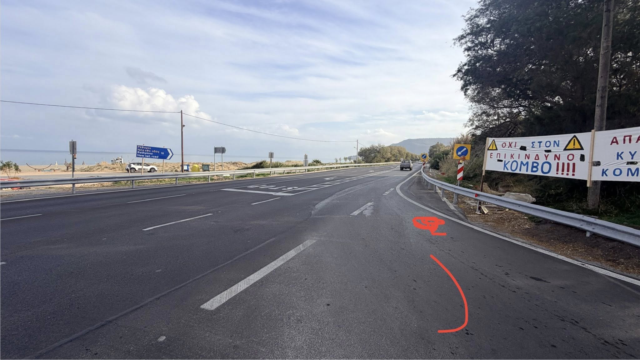 Παρατήρησα επίσης διακοπή πορείας μόνο με οριζόντια σήμανση, χωρίς καμία κάθετη, ώστε να δοθεί η δυνατότητα κίνησης προς τα αριστερά — ίσως η πιο επικίνδυνη ενέργεια που μπορεί να συμβεί σε τέτοιους δρόμους.
