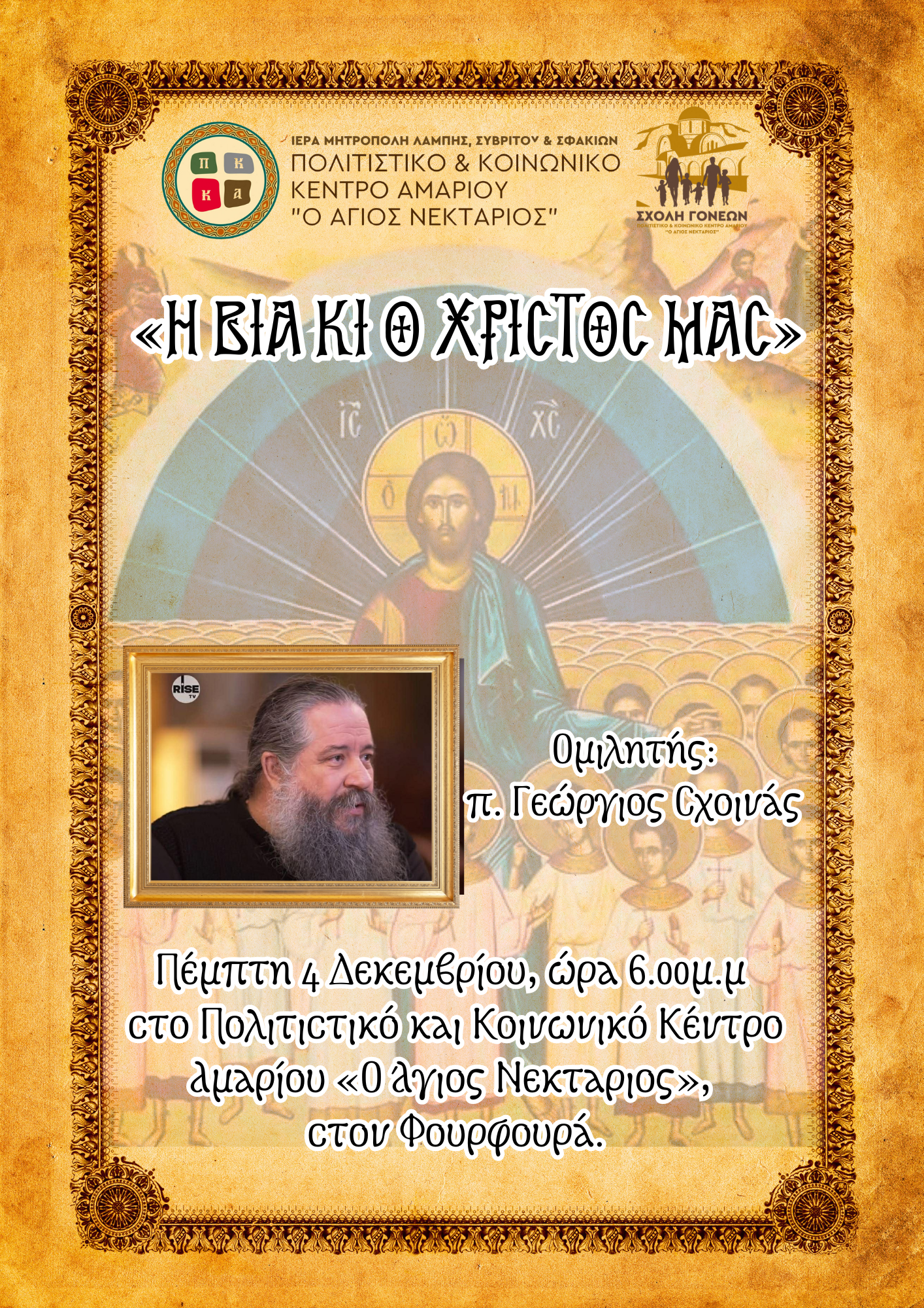 Η ομιλία και 1η συνάντηση της Σχολής Γονέων θα πραγματοποιηθεί την Πέμπτη 4 Δεκεμβρίου και ώρα 6.00μ.μ. στο Πολιτιστικό και Κοινωνικό Κέντρο Αμαρίου «Ο Άγιος Νεκτάριος», στον Φουρφουρά, από τον Πρωτοπρεσβύτερο π. Γεώργιο Σχοινά, δόκιμο ομιλητή και έμπειρο κληρικό της Ιεράς Αρχιεπισκοπής Αθηνών.