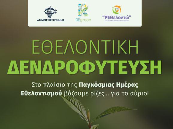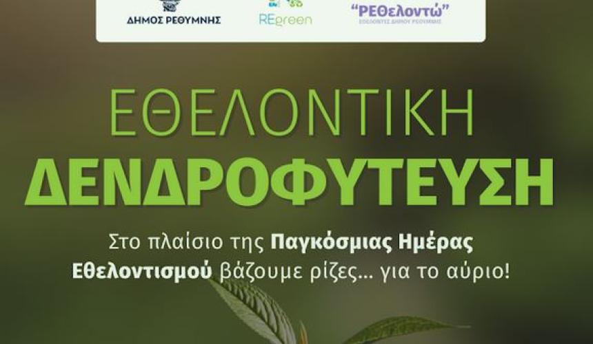 Με την ευκαιρία του εορτασμού της Διεθνούς Ημέρας Εθελοντισμού για την οικονομική και κοινωνική ανάπτυξη που τιμάται κάθε 5η Δεκεμβρίου εκάστου έτους, ο Δήμος Ρεθύμνης οργανώνει εθελοντική δενδροφύτευση καλώντας μικρούς και μεγάλους να υποστηρίξουν εμπράκτως τα ιδεώδη του εθελοντικού κινήματος.