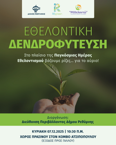 Ειδικότερα, η Διεύθυνση Περιβάλλοντος του Δήμου Ρεθύμνης, το Τμήμα Πρασίνου και το Δίκτυο Εθελοντών "ΡΕΘΕΛΟΝΤΩ", θα πραγματοποιήσουν την Κυριακή 07 Δεκεμβρίου 2025 στις 10:30 π.μ. εθελοντική δενδροφύτευση στον χώρο πρασίνου στον κόμβο Ατσιποπούλου, στην έξοδος του οικισμού προς Γάλλου.