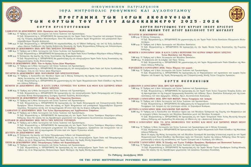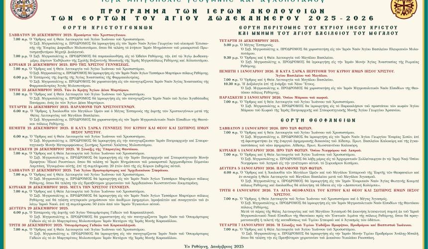 7.00 μ.μ. Ο Σεβ. Μητροπολίτης κ. ΠΡΟΔΡΟΜΟΣ θα παρακολουθήση, εις το Ωδείον Ρεθύμνης, την, επί τω Αγίω Δωδεκαημέρω, εόρτιον Εκδήλωσιν της Σχολής Βυζαντινής Μουσικής της Ιεράς Μητροπόλεως Ρεθύμνης και Αυλοποτάμου.
