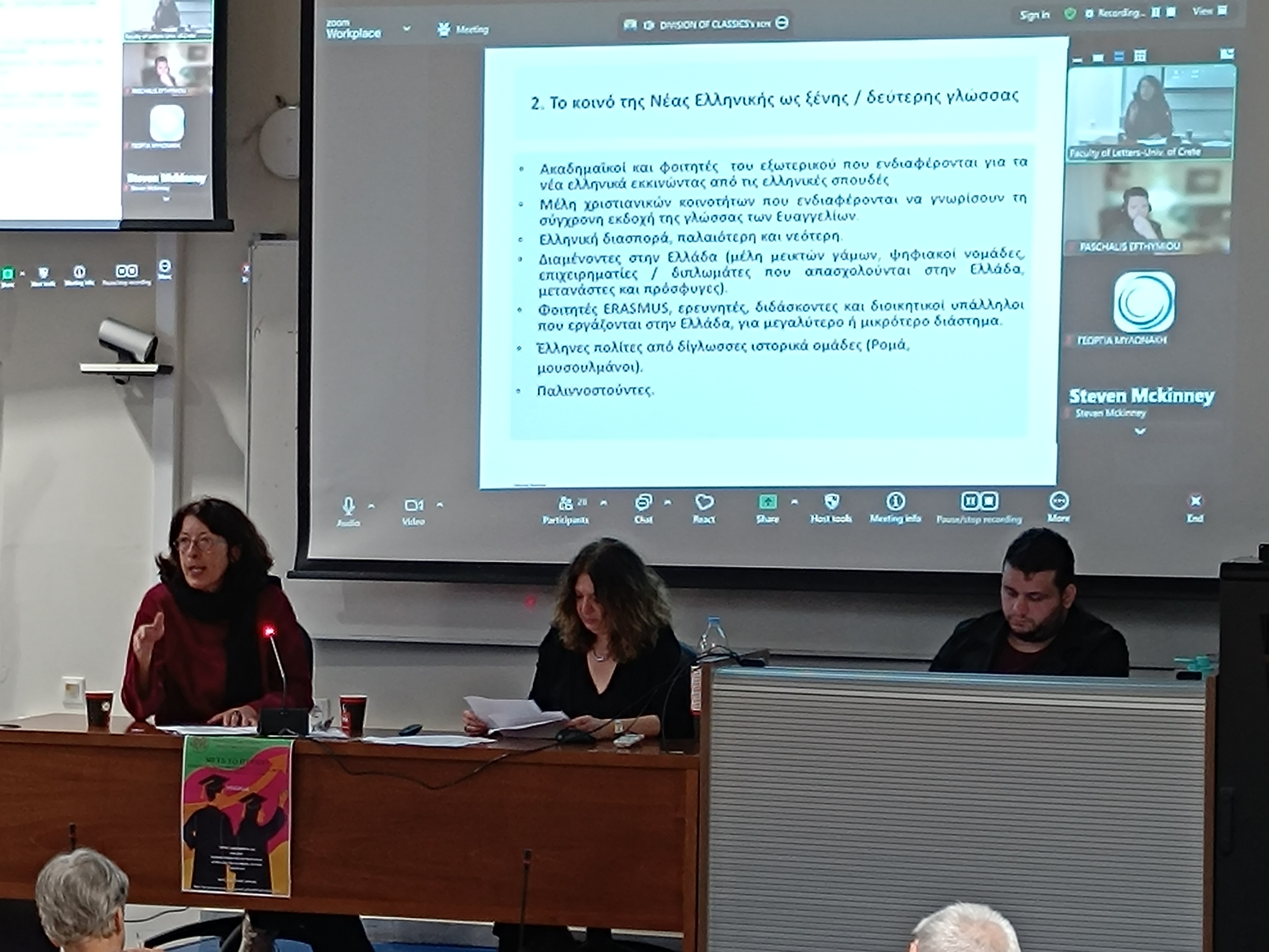 Η διδασκαλία των ελληνικών παρέμεινε φυσικά στο επίκεντρο, με τη Μαρία Πουλοπούλου και τον Πασχάλη Ευθυμίου να αποκαλύπτουν την «Κρυφή γοητεία των Νέων Ελληνικών» και τις προοπτικές διδασκαλίας της γλώσσας τόσο στην Ελλάδα και την Ευρώπη όσο και παγκόσμια, όπου το ενδιαφερόμενο κοινό είναι απροσδόκητα μεγάλο. Παράλληλα, η Μαίρη Γριβέα και ο Νίκος Μανωλόπουλος μίλησαν για το έργο των φιλολόγων στη φροντιστηριακή πραγματικότητα, αναδεικνύοντας την ελευθερία και τη δημιουργικότητα όταν διδάσκει κανείς σε μικρές φροντιστηριακές τάξεις.
