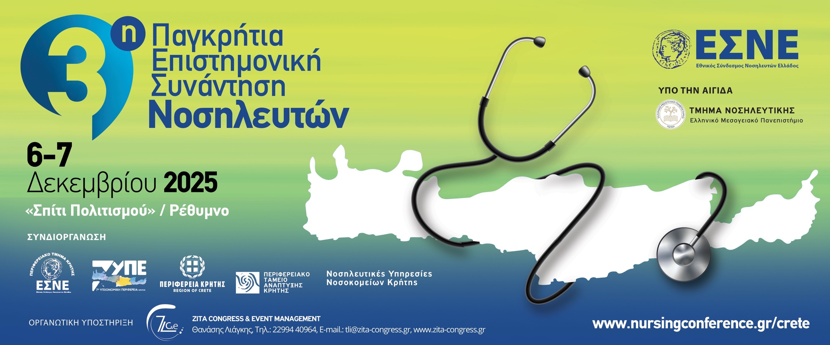Το Περιφερειακό Τμήμα Κρήτης του Εθνικού Συνδέσμου Νοσηλευτών Ελλάδος (ΕΣΝΕ), σε συνεργασία με τις Νοσηλευτικές Υπηρεσίες των Νοσοκομείων της Κρήτης και υπό την αιγίδα του Τμήματος Νοσηλευτικής του Ελληνικού Μεσογειακού Πανεπιστημίου (ΕΛ.ΜΕ.ΠΑ.), διοργανώνει την 3η Παγκρήτια Επιστημονική Συνάντηση Νοσηλευτών, η οποία θα πραγματοποιηθεί στις 6–7 Δεκεμβρίου 2025 στο «Σπίτι Πολιτισμού», στο Ρέθυμνο.