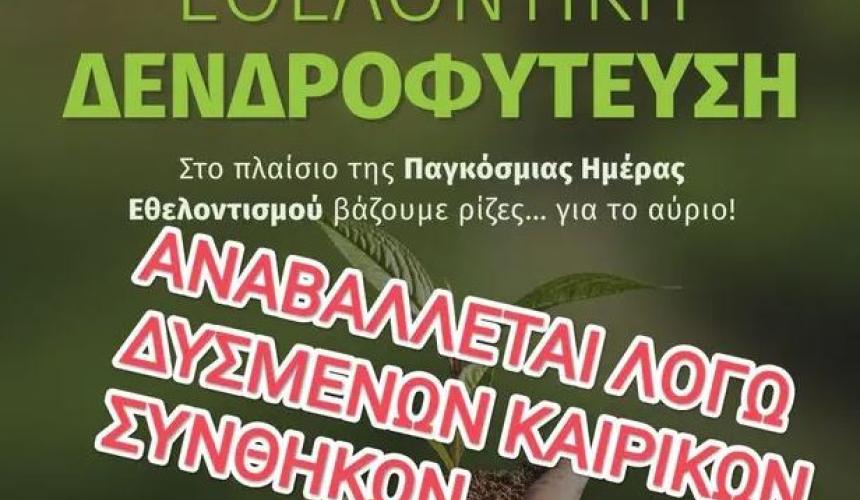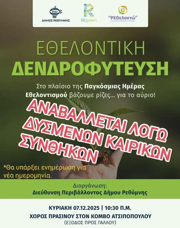 Ο Δήμος Ρεθύμνης ενημερώνει ότι λόγω δυσμενών καιρικών συνθηκών αναβάλλεται η εκδήλωση της Εθελοντικής Δενδροφύτευσης που επρόκειτο να πραγματοποιηθεί στο πλαίσιο της Παγκόσμιας Ημέρας Εθελοντισμού, την Κυριακή, 7 Δεκεμβρίου στις 10:30 στον Κόμβο Ατσιποπούλου.