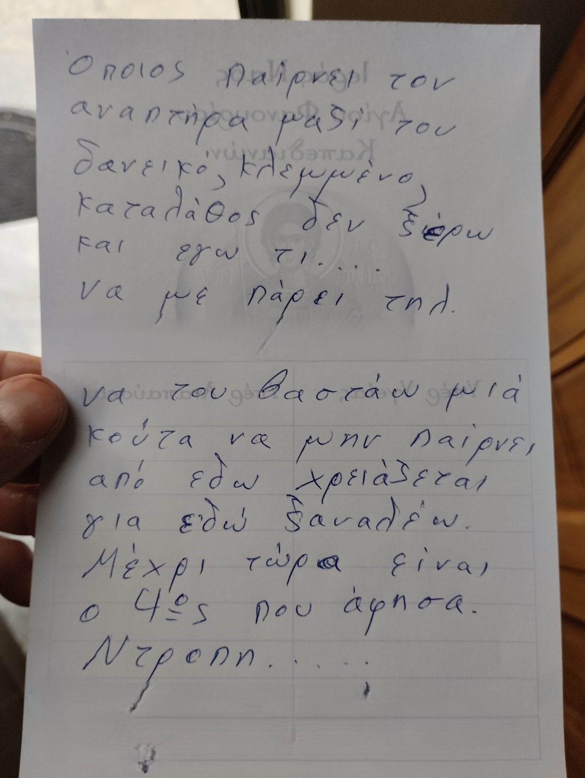 Ένα απλό, καθημερινό περιστατικό στάθηκε αφορμή για την αγανάκτηση ενός πιστού στο Ρέθυμνο, ο οποίος, όπως αναφέρει σε χειρόγραφο σημείωμα που άφησε στην εκκλησία, βλέπει τον αναπτήρα που αφήνει για το άναμμα των κεριών να «εξαφανίζεται» κάθε φορά. Όπως σημειώνει, έχει ήδη αγοράσει και αφήσει τέσσερις αναπτήρες, οι οποίοι όμως χάνονται διαδοχικά.