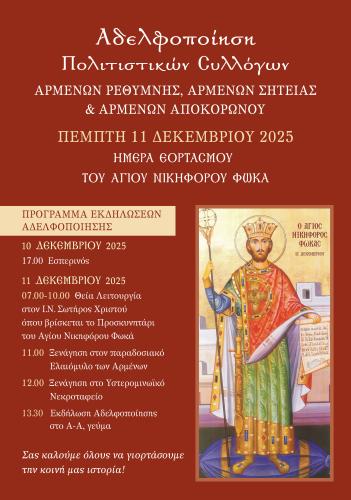 Ο Πολιτιστικός Σύλλογος Αρμένων ανακοινώνει με χαρά τη διοργάνωση της εκδήλωσης Αδελφοποίησης μεταξύ των τριών Πολιτιστικών Συλλόγων Αρμένων: Ρεθύμνης, Σητείας και Αποκορώνου. Η σημαντική αυτή πρωτοβουλία αποσκοπεί στην ανάδειξη της κοινής ιστορικής και πολιτιστικής ταυτότητας των Αρμένων, στην ενίσχυση των δεσμών των κοινοτήτων μας και στη δημιουργία σταθερών συνεργασιών για το μέλλον.