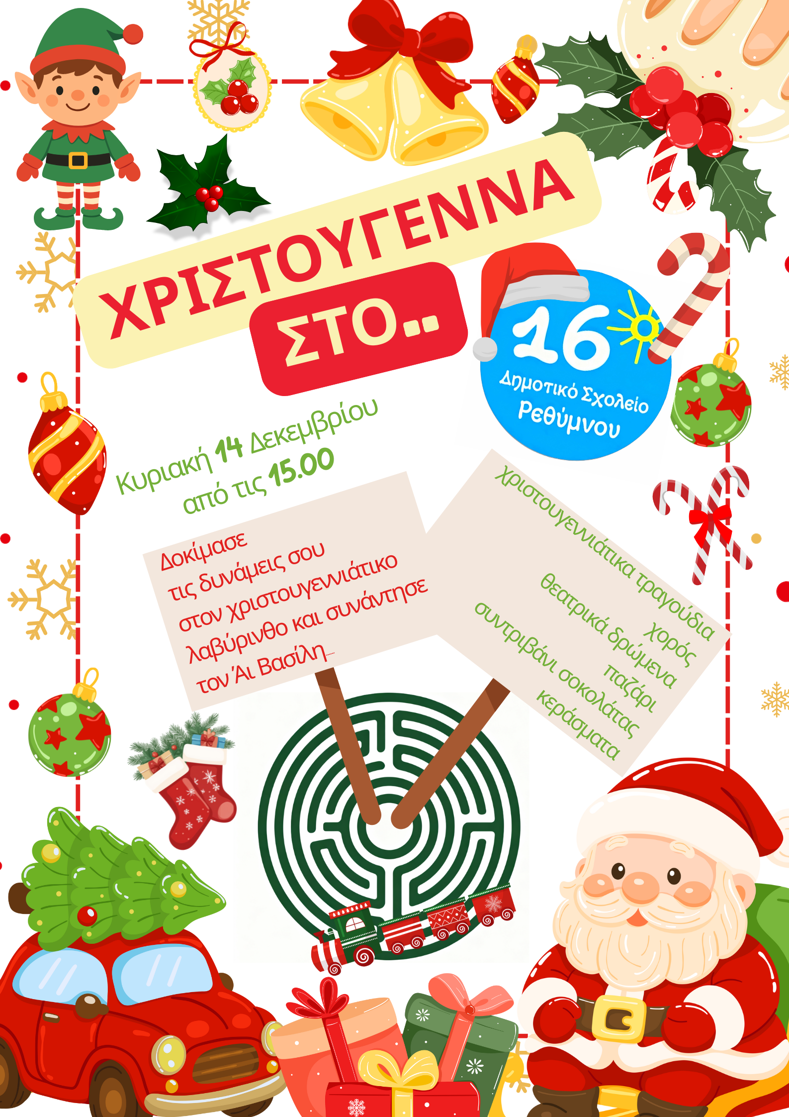 Την Κυριακή 14 Δεκεμβρίου, στις 3:00 μ.μ., το 16ο Δημοτικό Σχολείο μεταμορφώνεται σε έναν μαγικό χριστουγεννιάτικο λαβύρινθο γεμάτο εκπλήξεις!