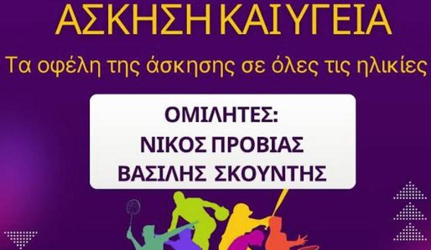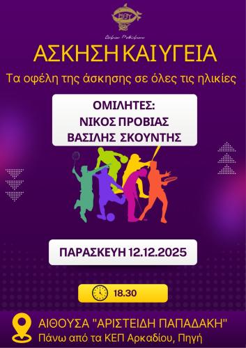 Μια πολύ ενδιαφέρουσα εσπερίδα με τίτλο «ΑΣΚΗΣΗ ΚΑΙ ΥΓΕΙΑ: Τα οφέλη της άσκησης σε όλες τις ηλικίες» θα πραγματοποιηθεί την ερχόμενη Παρασκευή 12 Δεκεμβρίου με ώρα έναρξης 18:30, στην αίθουσα εκδηλώσεων «Αριστείδης Παπαδάκης» που βρίσκεται στην Πηγή, πάνω από το ΚΕΠ Αρκαδίου.