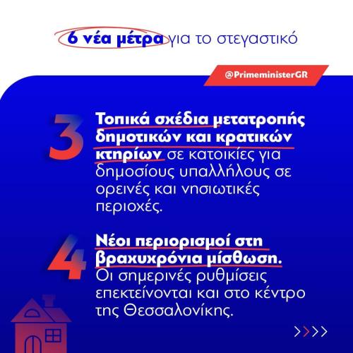 Παράλληλα, ιδιαίτερη αναφορά αξίζει να γίνει στις χθεσινές εξαγγελίες του Πρωθυπουργού κ. Κυριάκου Μητσοτάκη, κατά τη συζήτηση του κρατικού προϋπολογισμού στη Βουλή, όπου παρουσίασε έξι νέα μέτρα για την αντιμετώπιση του στεγαστικού ζητήματος. Ανάμεσα σε αυτά περιλαμβάνονται και τα τοπικά σχέδια μετατροπής δημοτικών και κρατικών κτιρίων σε κατοικίες για δημοσίους υπαλλήλους σε ορεινές και νησιωτικές περιοχές.
