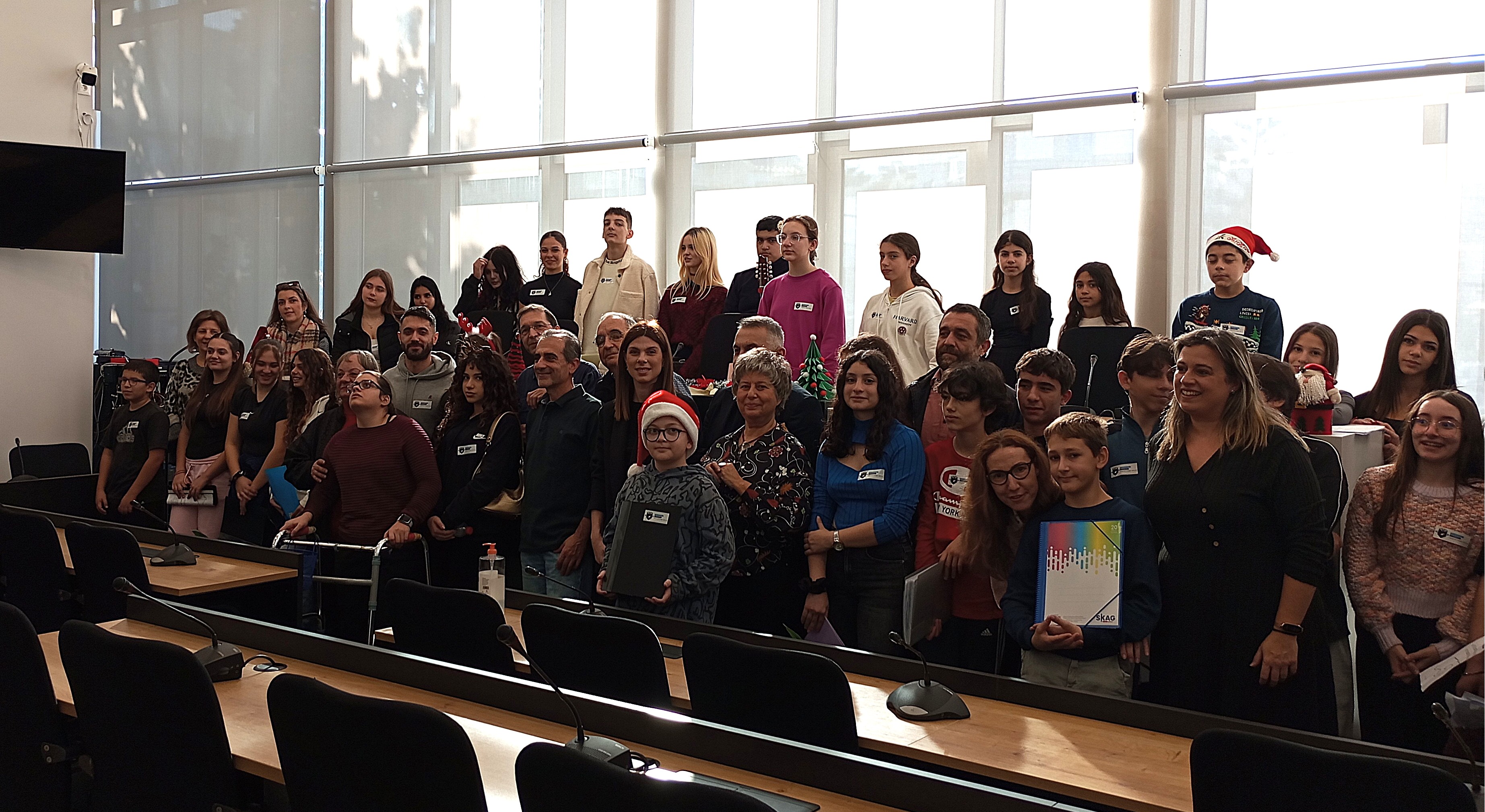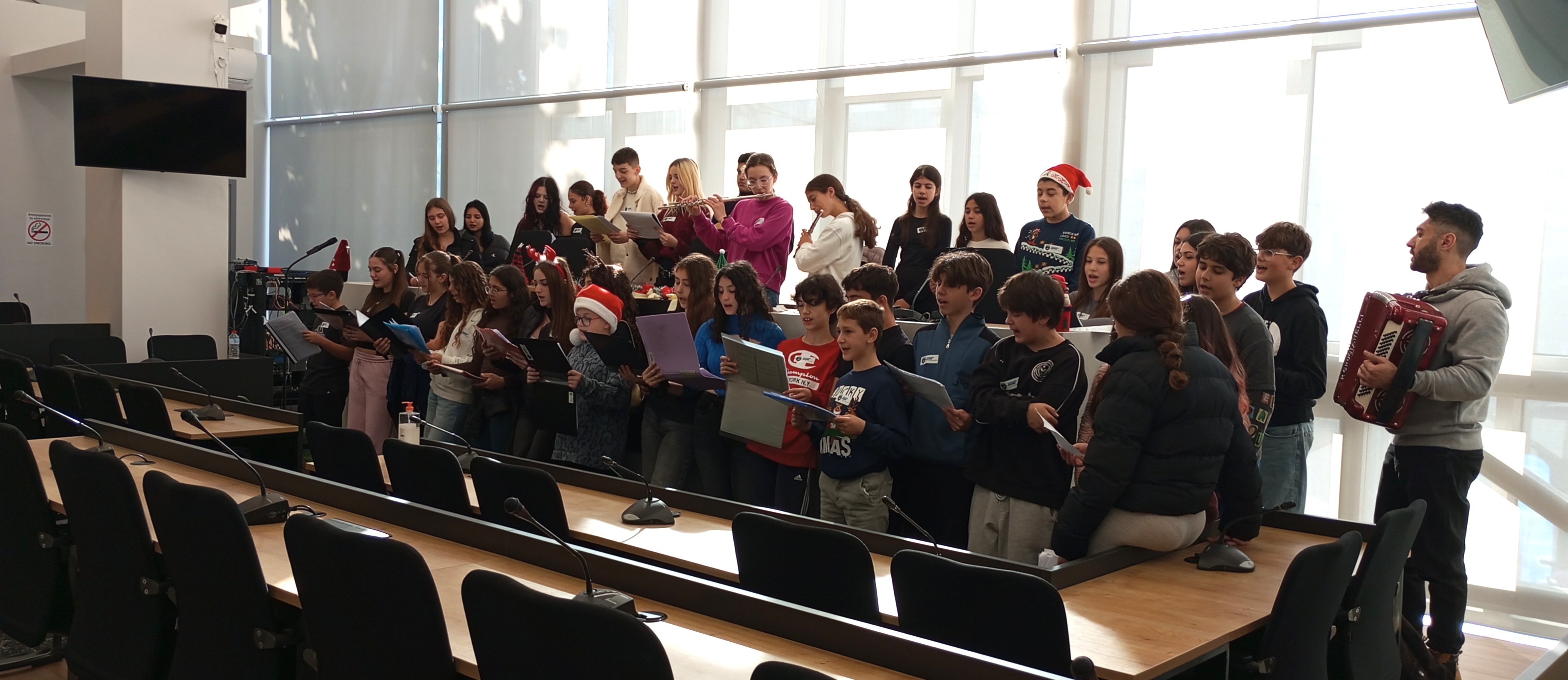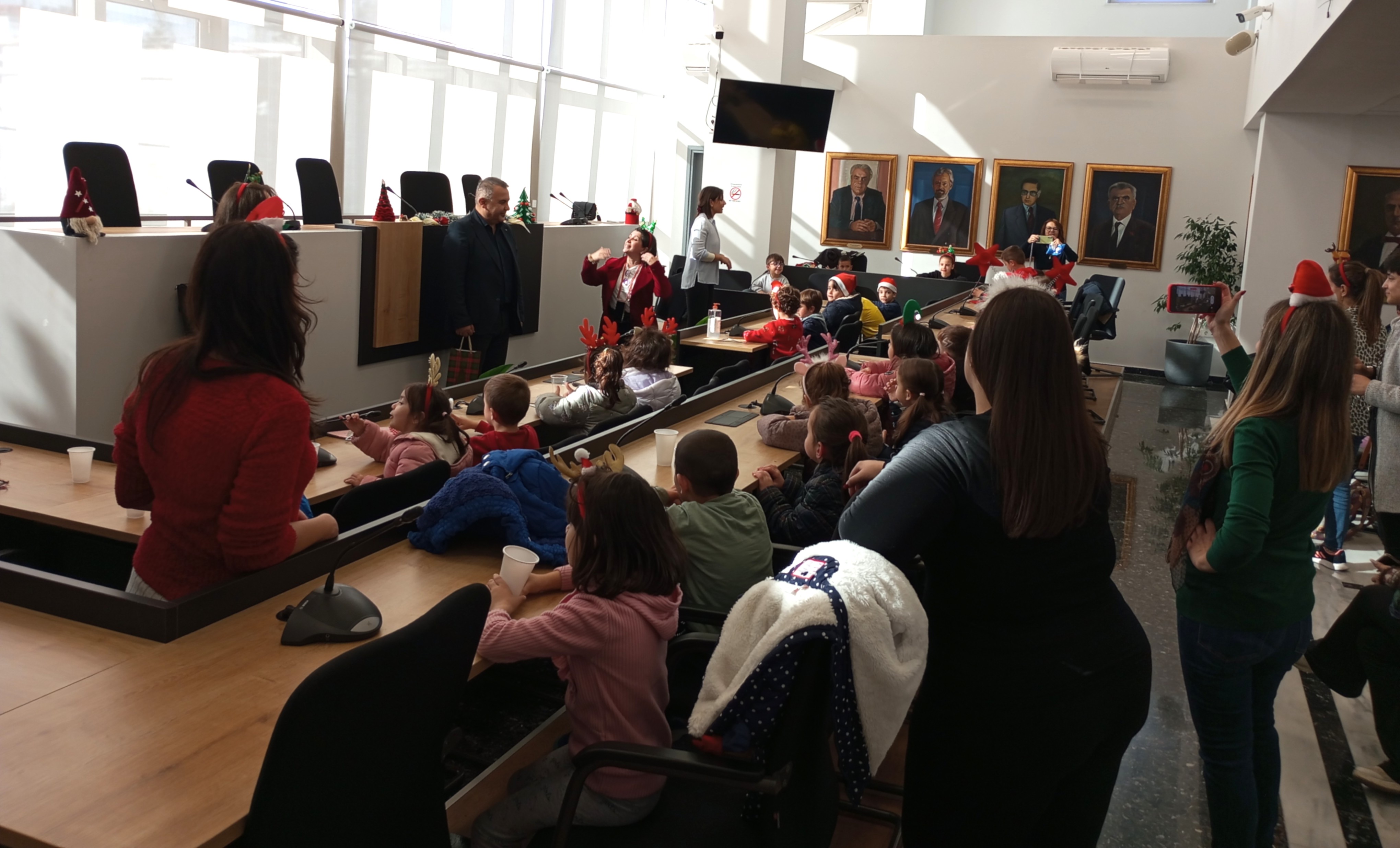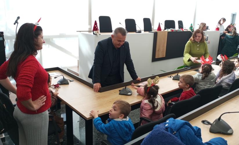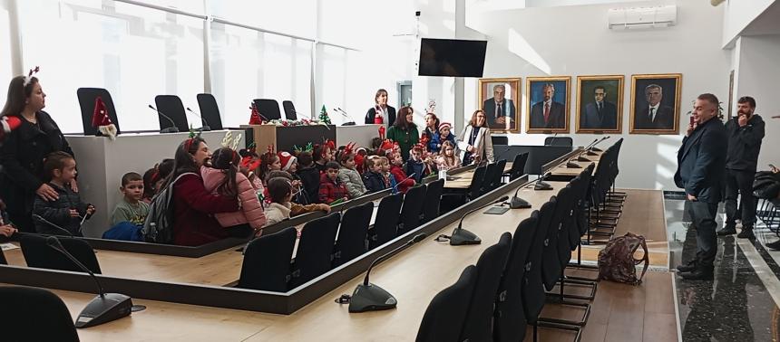 Στη συνέχεια, τη σκυτάλη πήραν οι μικροί μαθητές και μαθήτριες του 4ου Νηπιαγωγείου. Με ενθουσιασμό και παιδικές φωνές, τραγούδησαν τα κάλαντα και γιορτινά τραγούδια, μεταφέροντας το κέφι τους σε όλο το Δημαρχείο.