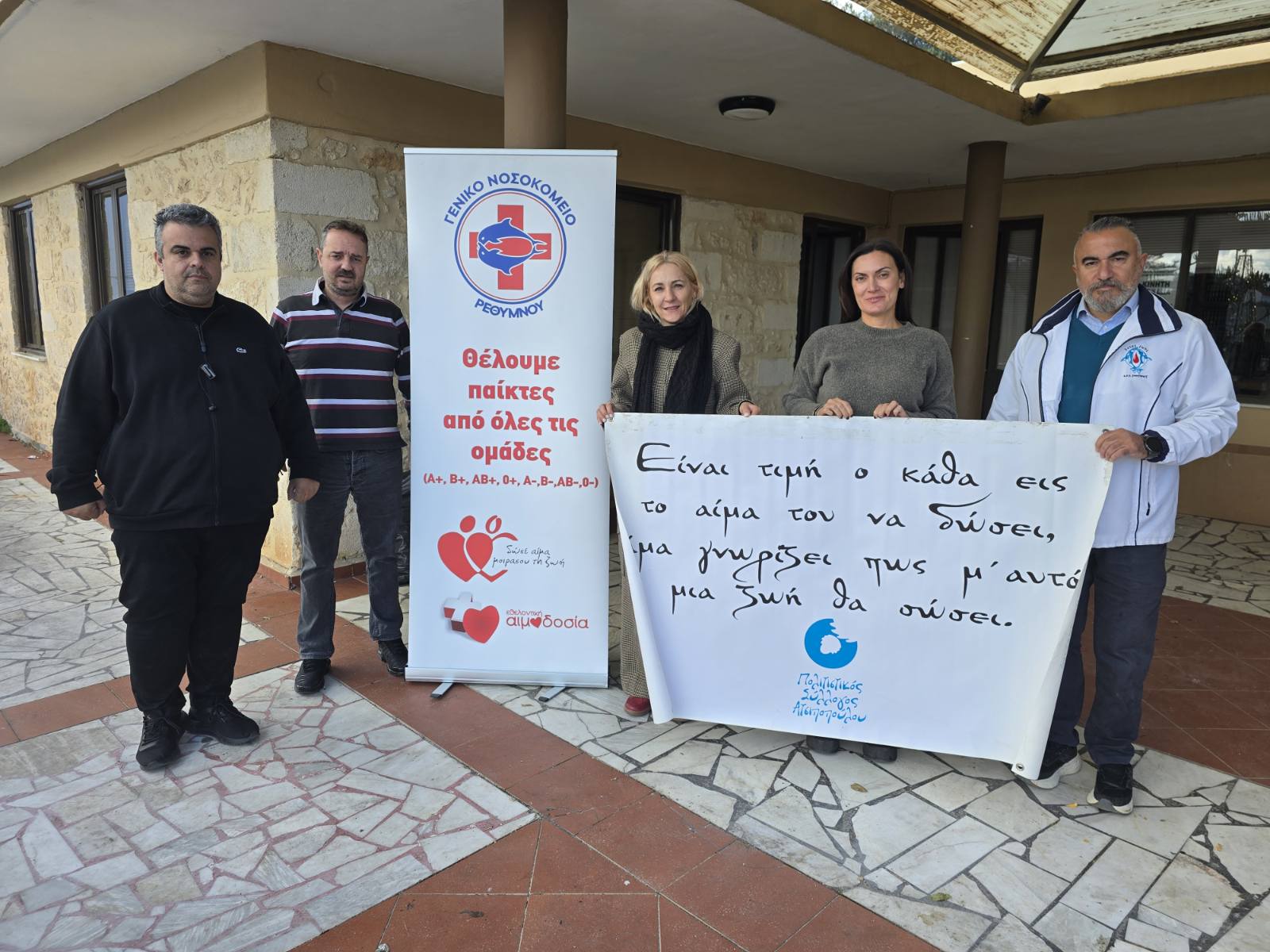 Ιδιαίτερες ευχαριστίες απευθύνουμε επίσης στο προσωπικό του Νοσοκομείου Ρεθύμνου για την πολύτιμη συνδρομή του και τον επαγγελματισμό με τον οποίο υποστήριξε την αιμοδοσία, συμβάλλοντας καθοριστικά στην ομαλή και ασφαλή διεξαγωγή της διαδικασίας.