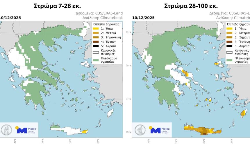 Παρά τη γενικευμένη βελτίωση της εδαφικής υγρασίας στη χώρα μετά τον βροχερό Νοέμβριο και την κακοκαιρία «Byron», η Κρήτη εξακολουθεί να ξεχωρίζει αρνητικά στον χάρτη της ξηρασίας. Σύμφωνα με την ανάλυση της ομάδας ΜΕΤΕΟ του ΕΑΑ για τις 10 Δεκεμβρίου 2025, στο βαθύτερο στρώμα υπεδάφους (28–100 εκ.), που αποτυπώνει τη συσσώρευση υγρασίας των τελευταίων μηνών, μεγάλο μέρος της ηπειρωτικής Ελλάδας εμφανίζει πλέον πλεόνασμα. Όχι όμως στο νησί μας. Στην Κρήτη καταγράφονται συνθήκες από ήπια έως και έντονη ξηρασία, γεγονός που δείχνει ότι τα αποθέματα νερού στο έδαφος παραμένουν ανεπαρκή, παρά τις πρόσφατες βροχοπτώσεις. Στο πιο επιφανειακό στρώμα (7–28 εκ.) η εικόνα είναι ελαφρώς βελτιωμένη, κυρίως λόγω των βροχών των αρχών Δεκεμβρίου, χωρίς όμως να αναιρείται η συνολική πίεση στις καλλιέργειες. Το μήνυμα είναι σαφές: στην Κρήτη το υδατικό στρες επιμένει και ο χειμώνας «καλείται» να καλύψει χαμένο έδαφος.
