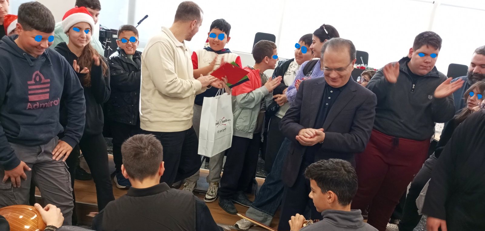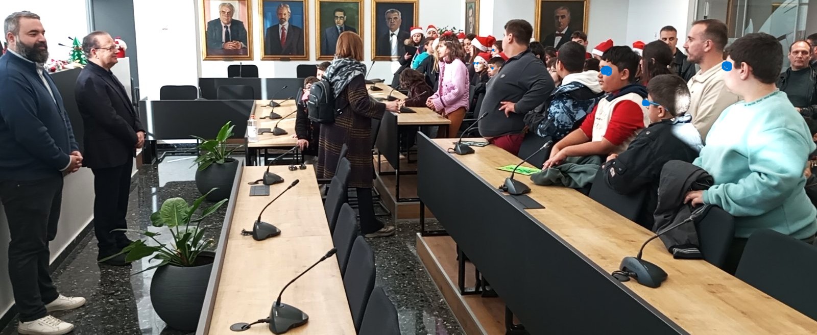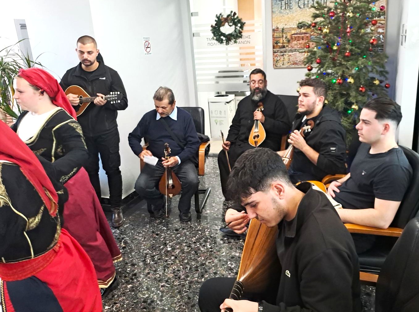 Την αρχή έκαναν οι μαθητές –τριες του Μουσικού Γυμνασίου – Λυκείου και του Ειδικού Σχολείου Ρεθύμνου. Με τις δροσερές φωνές τους, υπό τη συνοδεία μουσικών οργάνων σε επιδέξια χέρια νέων μουσικών, έψαλλαν τα κρητικά κάλαντα στον Δήμαρχο και τον Εντεταλμένο Δημ. Σύμβουλο Πρασίνου Γιώργη Παπαδόσηφο και τραγούδησαν αγαπημένους στίχους των Βασίλη Σκουλά και Θανάση Σκορδαλού. Ο Δήμαρχος ευχαρίστησε και συγχάρηκε τα παιδιά για τις εξαίρετες επιδόσεις τους, επισημαίνοντας πως «η Μουσική μας ενώνει και μας κάνει καλύτερους ανθρώπους» και τους ευχήθηκε να προοδεύσουν σε όλες τους τις επιλογές. Θερμές ευχές και αναμνηστικά δώρα κατέθεσε στους/στις συνοδούς εκπαιδευτικούς τους: Εκ μέρους του Μουσικού Σχολείου κ. Ηλία Πίτερη /Υποδιευθυντή, κ. Όλγα Ματθαίου, κ. Υγειονομάκη Μιχάλη και τον αιδεσιμότατο π. Κων/νο Χανιωτάκη/ Πρόεδρο του Συλλόγου Γονέων, και εκ μέρους του Ειδικού Σχολείου: κ. Λαζάνη Κων/νο/ Υποδιευθυντή, κ. Παπαδόπουλο Χρήστο, κ. Καλαγασίδη Βασιλική και κ. Βασιλειάδου Αριστέα.