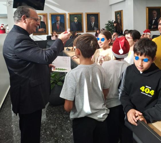 Με σκουφάκια του Αη Βασίλη, τρίγωνα, γελαστά πρόσωπα και μελωδικές φωνές έψαλλαν τα κάλαντα και πρόσφεραν στον Δήμαρχο εκλεπτυσμένη χειροποίητη κατασκευή με ευχές.