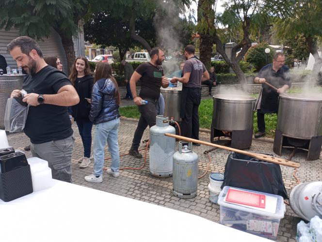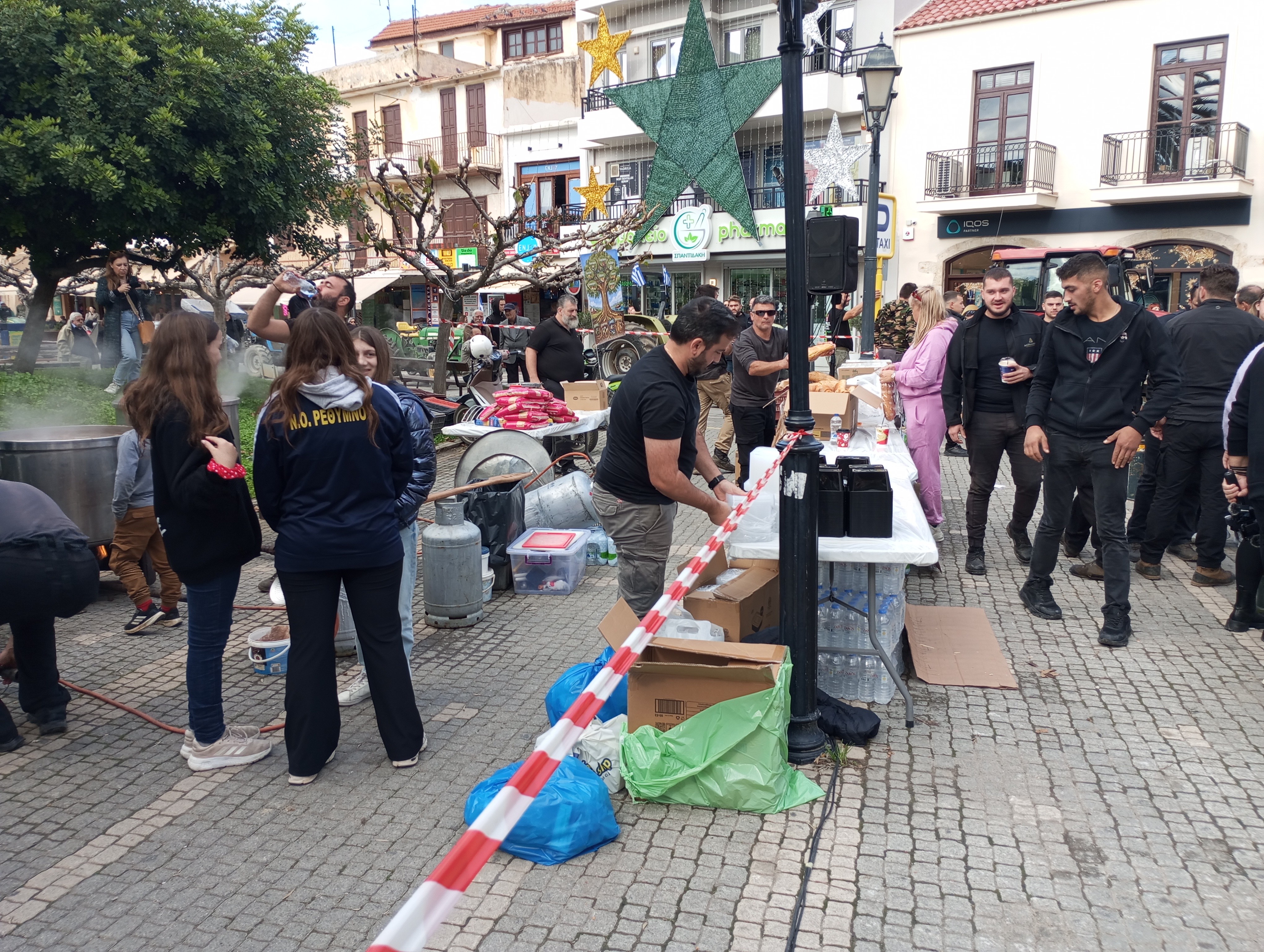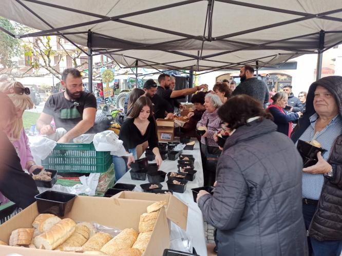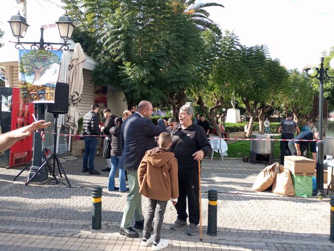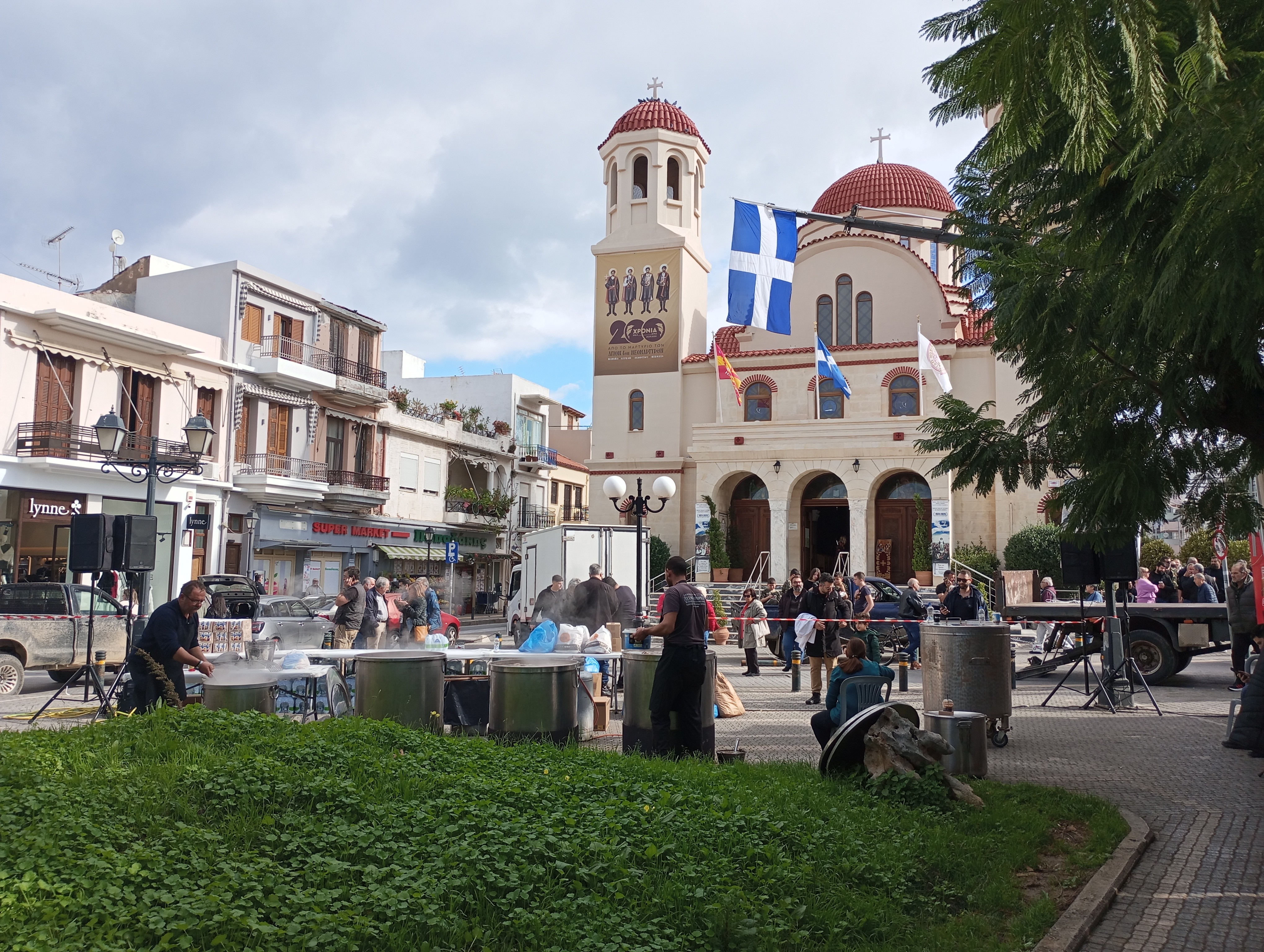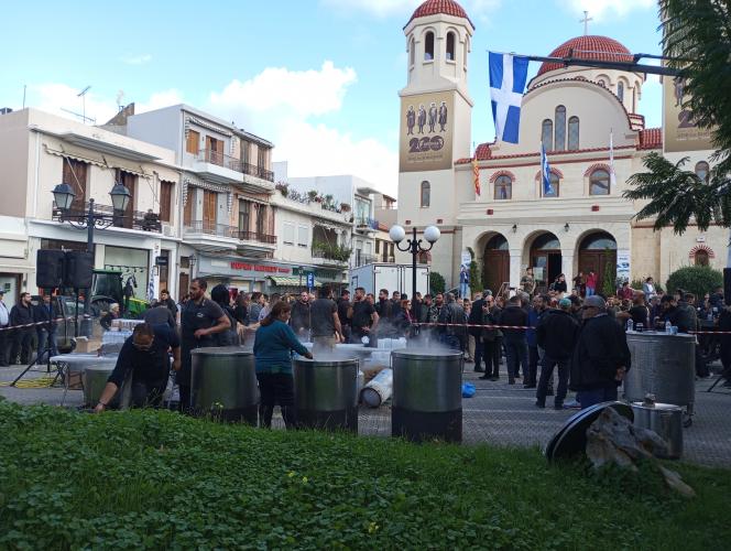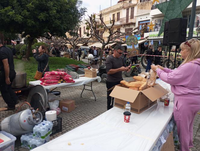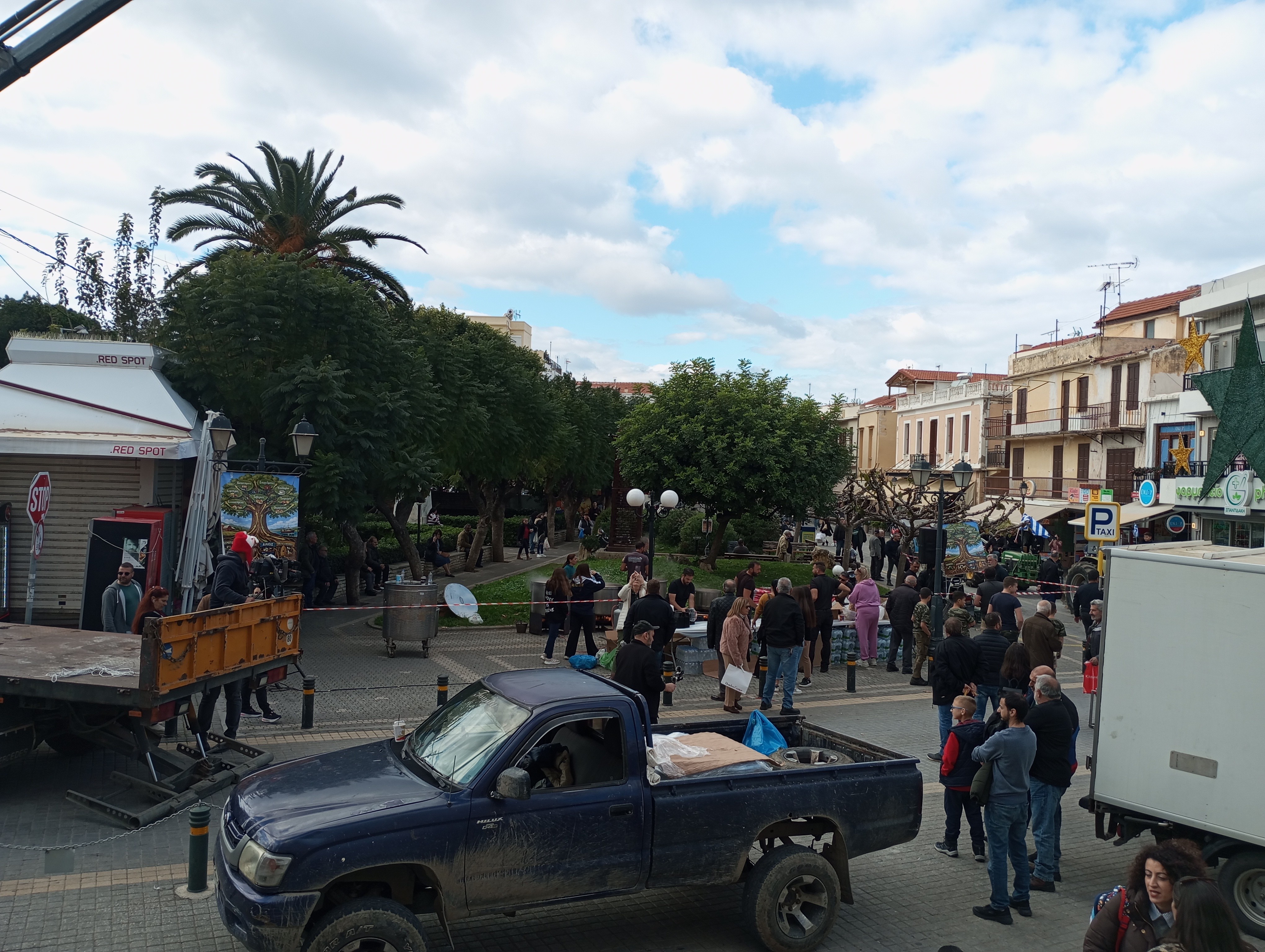 Από το πρωί ύψωσαν με γερανοφόρο όχημα μια μεγάλη Ελληνική Σημαία και έστησαν μεγάλα καζάνια στην Πλατεία Τεσσάρων Μαρτύρων όπου έβρασαν κρέας με σκοπό να το μοιράσουν σε όλο τον κόσμο που ήταν στην αγορά.