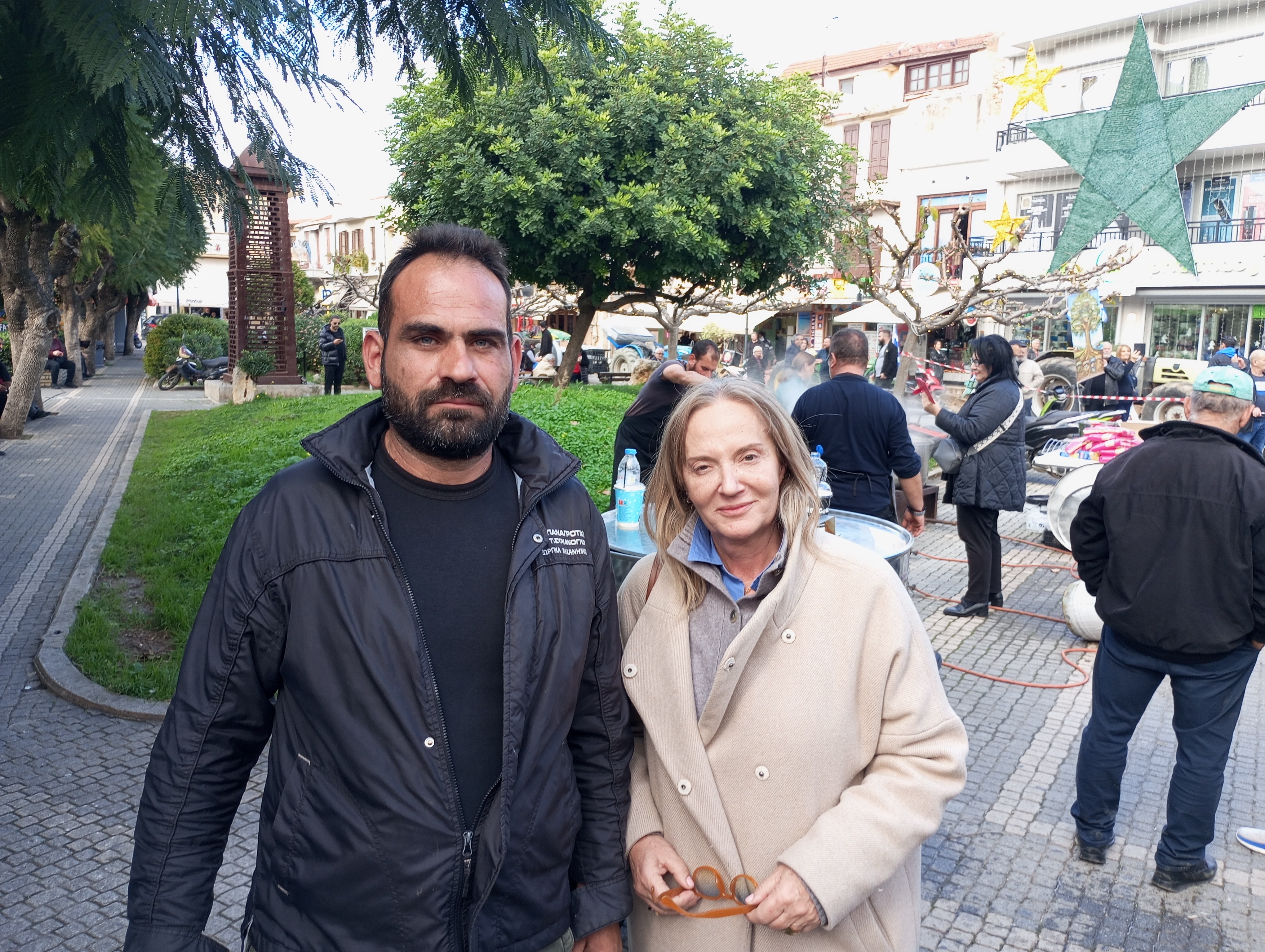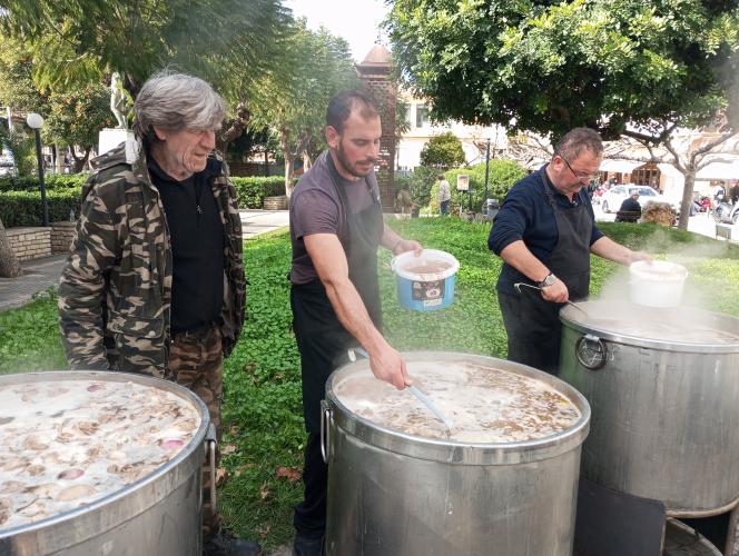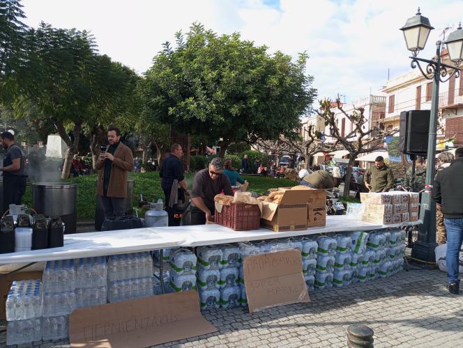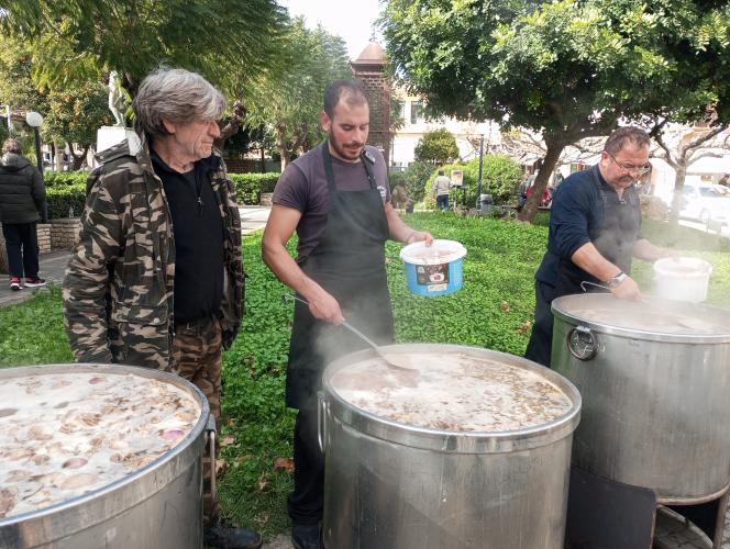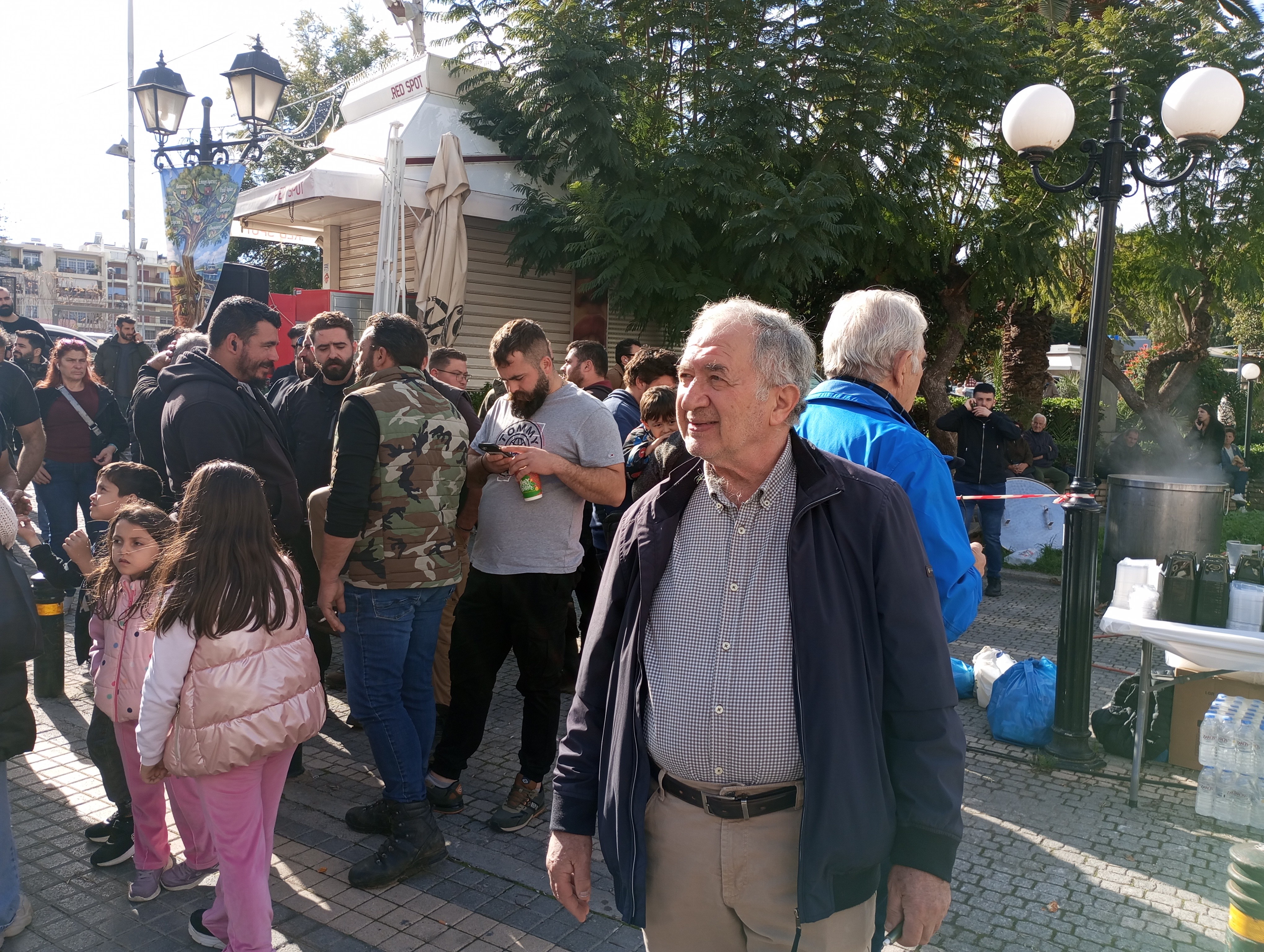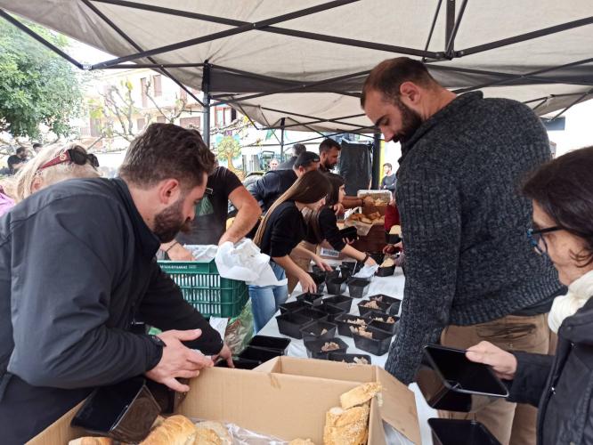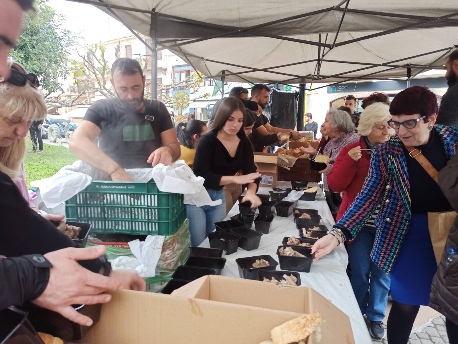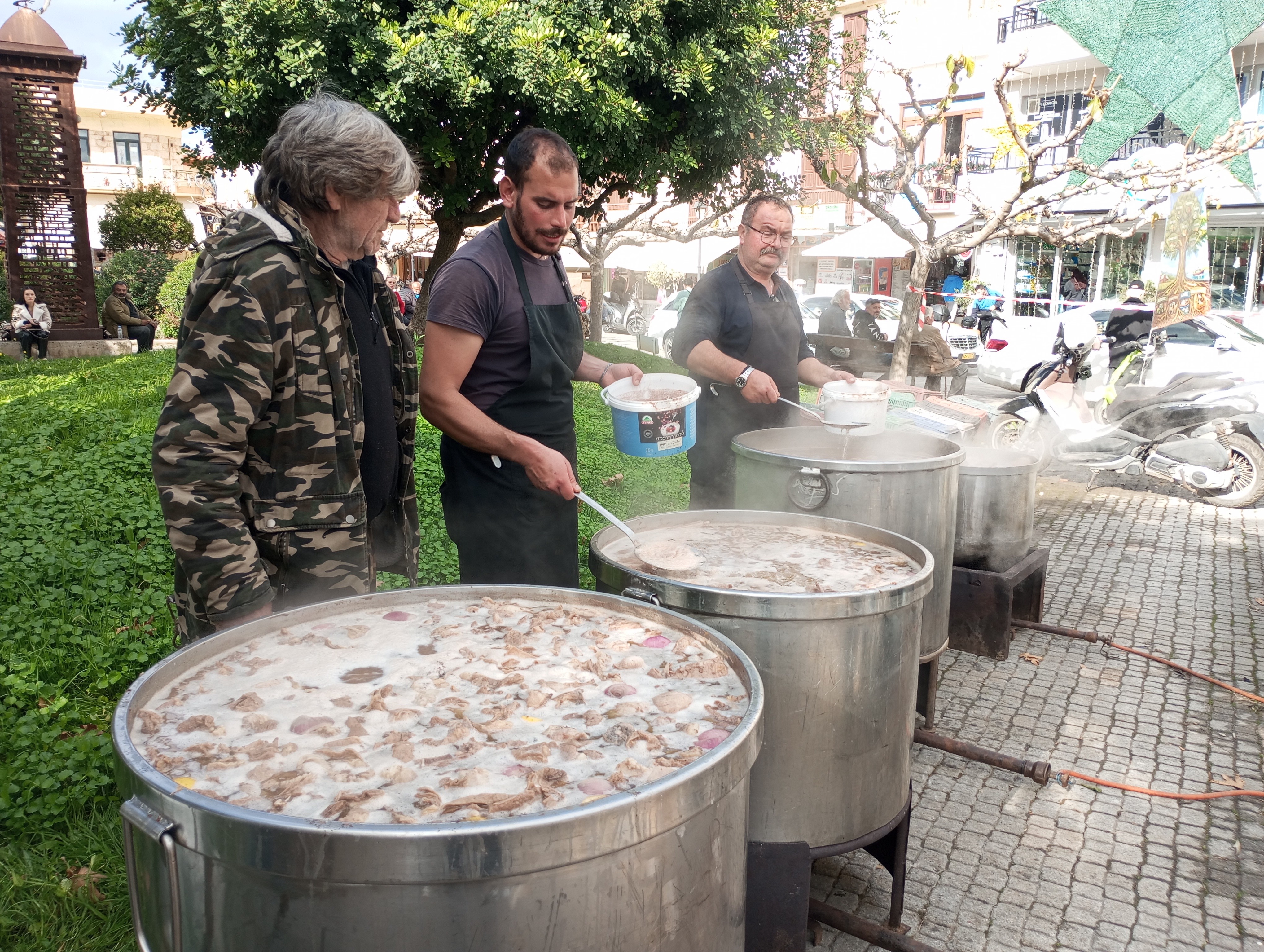 Από το πρωί ύψωσαν με γερανοφόρο όχημα μια μεγάλη Ελληνική Σημαία και έστησαν μεγάλα καζάνια στην Πλατεία Τεσσάρων Μαρτύρων όπου έβρασαν κρέας με σκοπό να το μοιράσουν σε όλο τον κόσμο που ήταν στην αγορά.