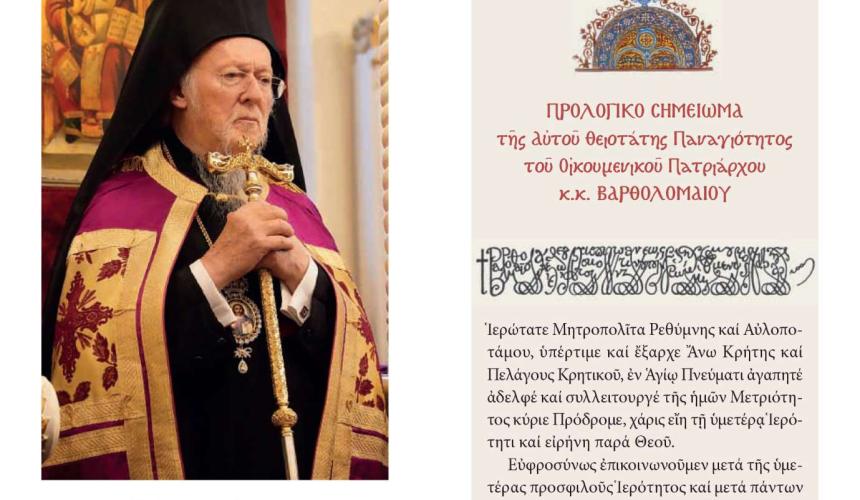 Το Ημερολόγιο προλογίζει με Σεπτό Ευλογητικό Γράμμα η Αυτού Θειοτάτη Παναγιότης ο Οικουμενικός Πατριάρχης κ.κ. ΒΑΡΘΟΛΟΜΑΙΟΣ, ενώ σε αυτό περιλαμβάνεται ευλαβής κατάθεση ψυχής της Αυτού Θειοτάτης Μακαριότητος του Πάπα και Πατριάρχου Αλεξανδρείας κ.κ. ΘΕΟΔΩΡΟΥ Β΄, ο οποίος είναι πνευματικό ανάστημα του μακαριστού Μητροπολίτου Ρεθύμνης και Αυλοποτάμου κυρού Θεοδώρου.