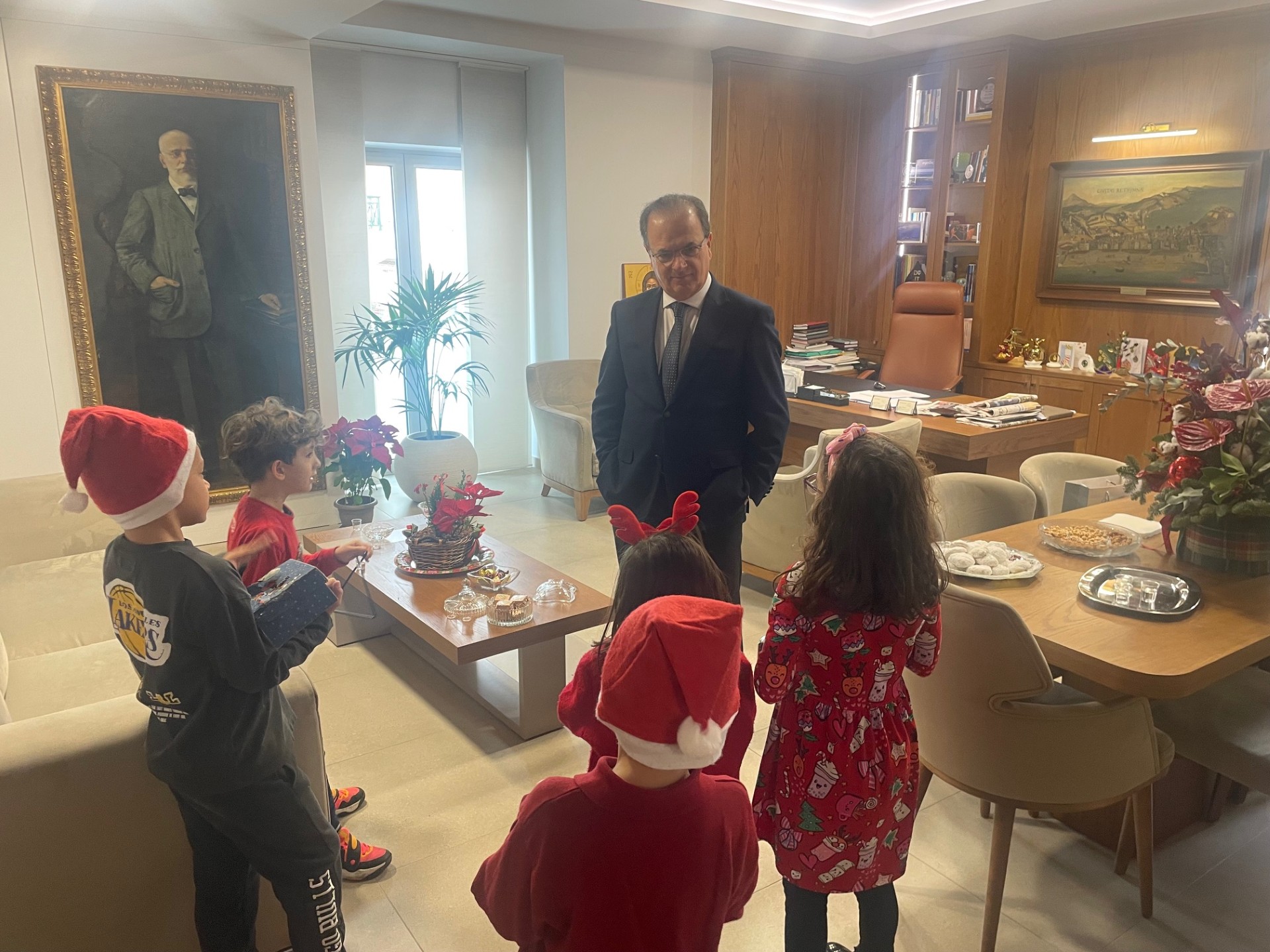 Εκτός από τις τρεις προγραμματισμένες επισκέψεις ο Δήμαρχος Ρεθύμνης άκουσε επίσης τα χαρμόσυνα κάλαντα της ημέρας από πολλές ομάδες παιδιών που τα υποδέχθηκε με μεγάλη χαρά στο γραφείο του, τα τράταρε και τους ευχήθηκε υγεία, δύναμη και πρόοδο.