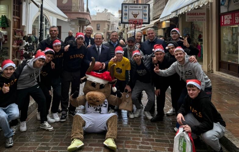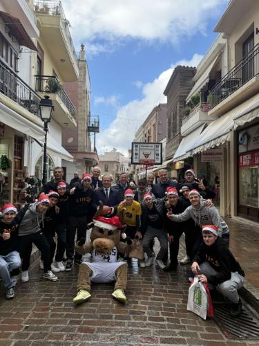Καθ’ οδόν μάλιστα συνάντησαν την αντιπροσωπεία της ομάδας μπάσκετ των Cretan Kings του Ρεθύμνου που αλώνιζαν την πόλη κουβαλώντας μια μπασκέτα, ζητώντας από τους περαστικούς να βάλουν καλάθι και μοιράζοντας δώρα σε όλους όσοι ευστοχούσαν στα σουτ.