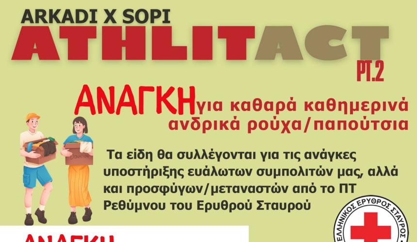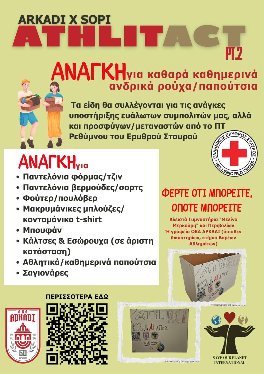 Ο Ο.Κ.Α. ΑΡΚΑΔΙ, σε συνεργασία με το Save Our Planet International (S.O.P.I.), ανακοινώνει την έναρξη διαρκούς δράσης συλλογής ρουχισμού και υπόδησης, στο πλαίσιο του κοινωνικού και εκπαιδευτικού προγράμματος AthlitAct.