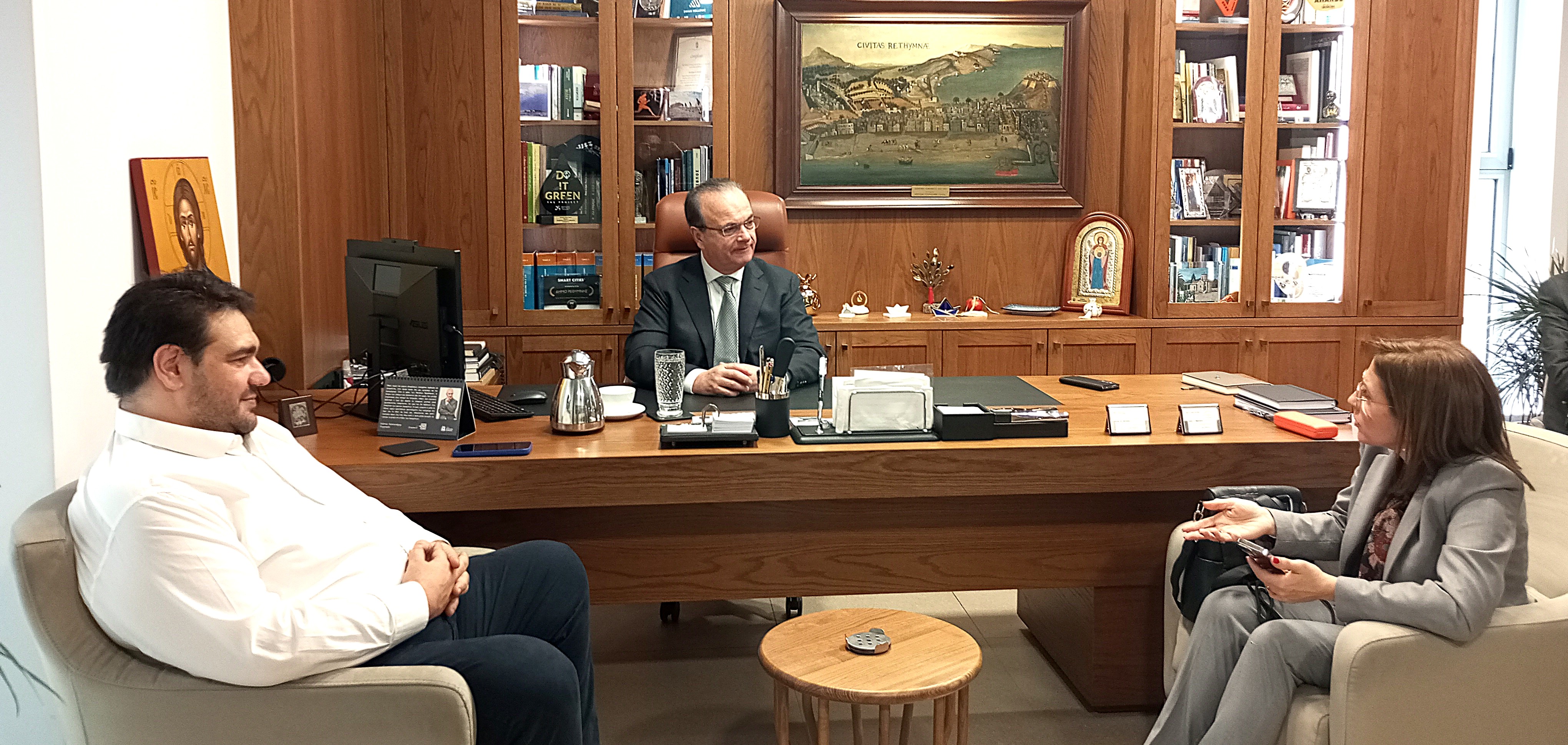 Στην συνέχεια ο κ. Δήμαρχος και οι συνεργάτες του υποδέχθηκαν τον κ. Υπουργό και την Γραμματέα της Αποκεντρωμένης Διοίκησης Κρήτης κ. Μαρία Κοζυράκη στο γραφείο του, όπου δόθηκε η ευκαιρία ανταλλαγής απόψεων και προτάσεων για το νέο κώδικα της αυτοδιοίκησης, τα ζητήματα των ΔΕΥΑ, τις ανάγκες του τομέα πολιτικής προστασίας, της παιδείας, του πολιτισμού και σειράς άλλων θεμάτων της αυτοδιοίκησης.
