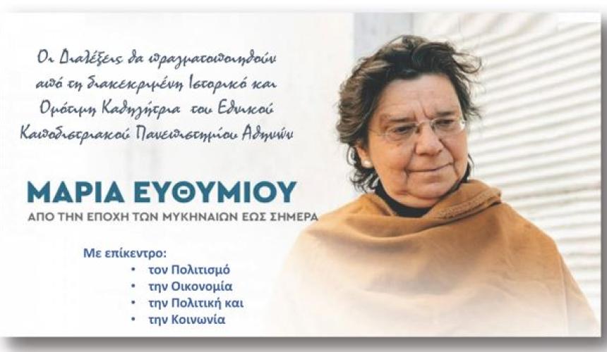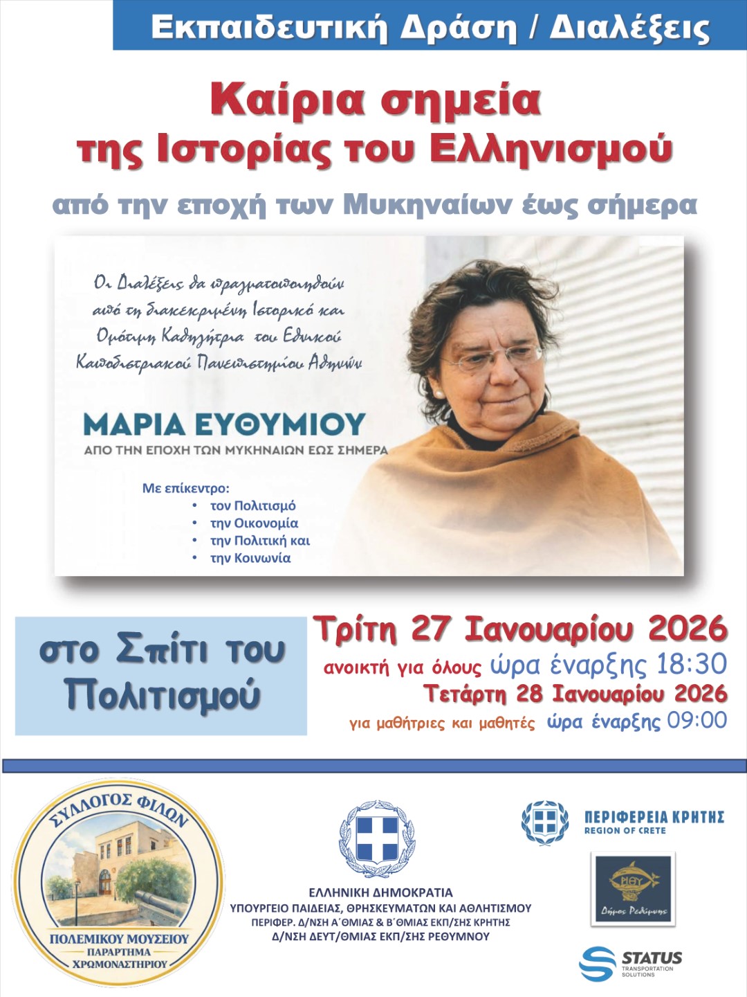 ΄΄Με μεγάλη χαρά σας προσκαλούμε να συμμετάσχετε στις εκδηλώσεις μας στο Σπίτι του Πολιτισμού, όπου μέσα από την ομιλία της κ. Μαρίας Ευθυμίου, θα ταξιδέψουμε στην πορεία του Ελληνισμού από τα μυκηναϊκά χρόνια έως σήμερα.