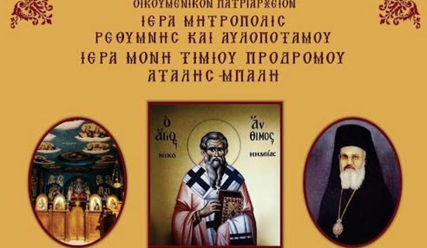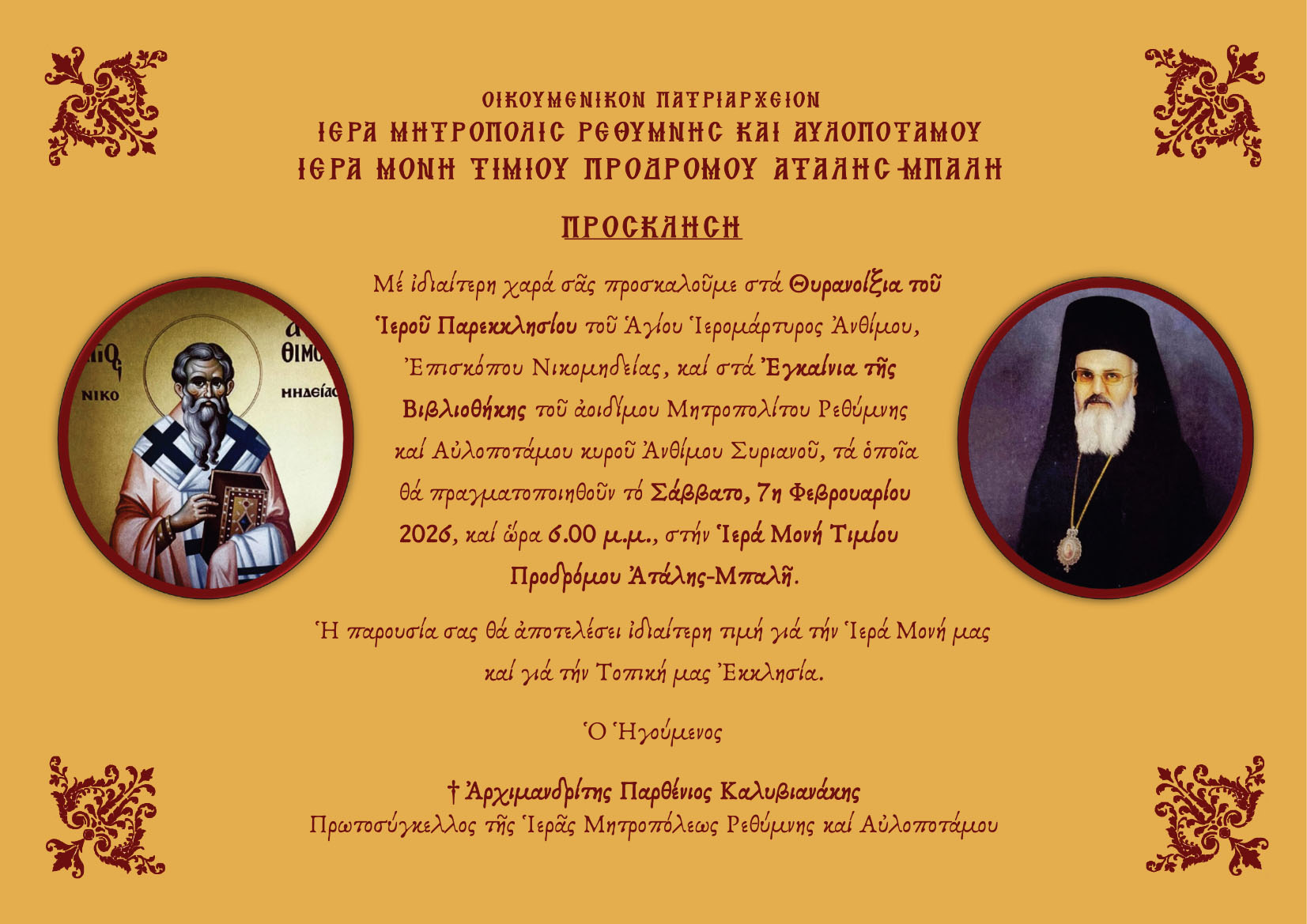 Με ιδιαίτερη χαρά σας προσκαλούμε στα Θυρανοίξια του Ιερού Παρεκκλησίου του Αγίου Ιερομάρτυρος Ανθίμου, Επισκόπου Νικομηδείας, και στα Εγκαίνια της Βιβλιοθήκης του αοιδίμου Μητροπολίτου Ρεθύμνης και Αυλοποτάμου κυρού Ανθίμου Συριανού, τα οποία θα πραγματοποιηθούν το Σάββατο, 7η Φεβρουαρίου 2026, και ώρα 6.00 μ.μ., στην Ιερά Μονή Τιμίου Προδρόμου Ατάλης-Μπαλή.