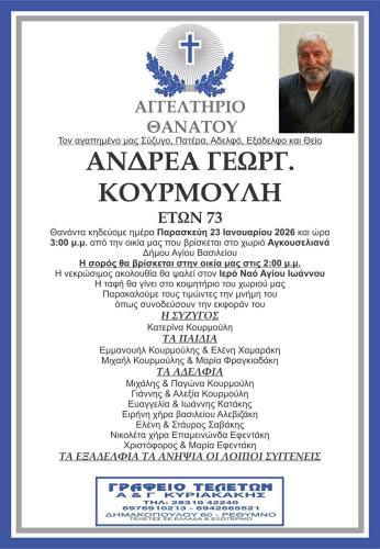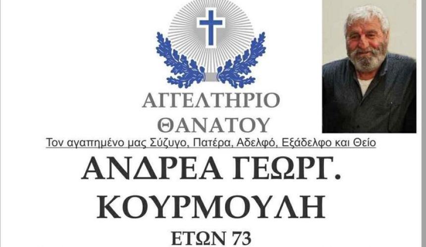 Σε κλίμα βαθιάς συγκίνησης και πένθους, η τοπική κοινωνία των Αγκουσελιανών στο Ρέθυμνο αποχαιρετά τον Ανδρέα Κουρμούλη, ο οποίος έφυγε από τη ζωή σε ηλικία 73 ετών. Η είδηση του θανάτου του προκάλεσε θλίψη σε συγγενείς, φίλους και συγχωριανούς, καθώς επρόκειτο για έναν άνθρωπο ιδιαίτερα αγαπητό και σεβαστό, με διακριτική αλλά ουσιαστική παρουσία στο χωριό. Ο εκλιπών υπήρξε αφοσιωμένος οικογενειάρχης, σύζυγος της Κατερίνας και πατέρας δύο παιδιών, του Μιχάλη και του Μανώλη. Η εξόδιος ακολουθία θα τελεστεί σήμερα, Παρασκευή 23 Ιανουαρίου, στις 15.00, στον Ιερό Ναό Αγίου Ιωάννου στα Αγκουσελιανά, όπου η οικογένεια, οι φίλοι και οι συγχωριανοί του θα του απευθύνουν το τελευταίο αντίο. Η σορός θα βρίσκεται στην οικία του από τις 14.00 και η ταφή θα πραγματοποιηθεί στο κοιμητήριο του χωριού.