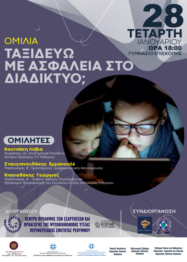 Το Κέντρο Πρόληψης των Εξαρτήσεων και Προαγωγής της Ψυχοκοινωνικής Υγείας Π.Ε Ρεθύμνης, με πρωτοβουλία του προέδρου κ. Σαρρή Μιχάλη, πρόκειται να υλοποιήσει καμπάνια ενημέρωσης-ευαισθητοποίησης της κοινότητας με θέμα: «Ταξιδεύω με Ασφάλεια στο Διαδίκτυο;» που θα απευθύνεται σε πολίτες όλης της Περιφερειακής Ενότητας Ρεθύμνου. Συνδιοργανωτές σε αυτήν την προσπάθεια θα είναι η Ιερά Μητρόπολη Ρεθύμνης και Αυλοποτάμου και η Ιερά Μητρόπολη Λάμπης, Συβρίτου και Σφακίων, οι Δήμοι της Π.Ε. Ρεθύμνου, η Αστυνομική Διεύθυνση Ρεθύμνου, οι Διευθύνσεις Πρωτοβάθμιας και Δευτεροβάθμιας Εκπαίδευσης Ρεθύμνου, καθώς και οι κατά τόπους φορείς.