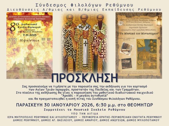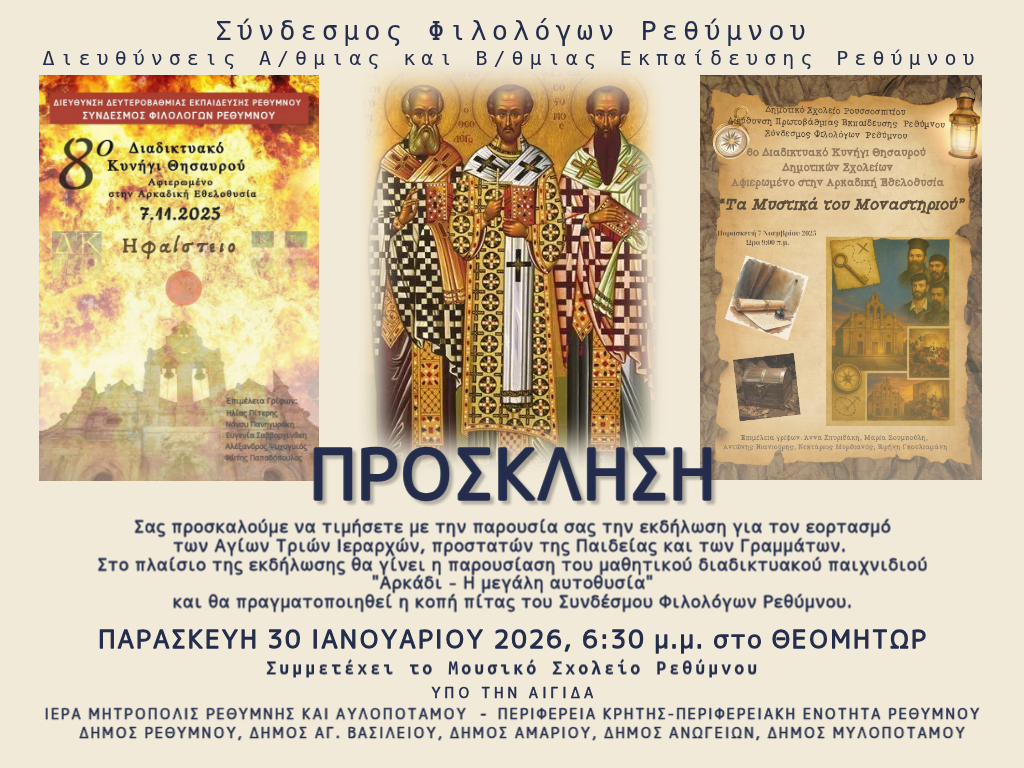Σας προσκαλούμε να τιμήσετε με την παρουσία σας την εκδήλωση για τον εορτασμό των Αγίων Τριών Ιεραρχών, προστατών της Παιδείας και των Γραμμάτων.