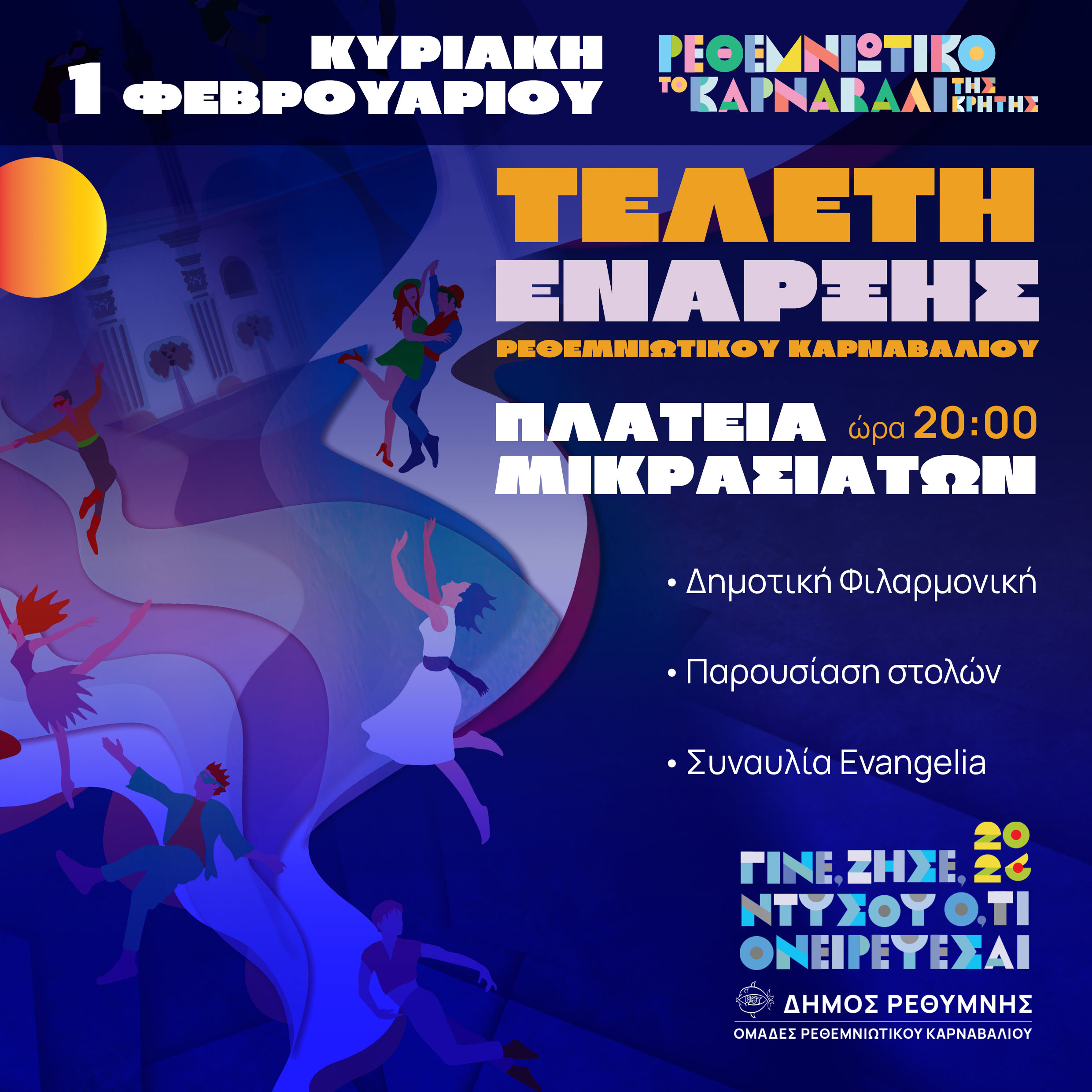 Το Ρεθεμνιώτικο Καρναβάλι σας προσκαλεί κοντά του για αξέχαστες στιγμές ξεγνοιασιάς απολαμβάνοντας μουσική, χορό, θεατρικά δρώμενα, εκθέσεις, τέχνες. Με βασικό άξονα τη δημιουργική έκφραση και σε ένα πλαίσιο συμπερίληψης και αποδοχής κάθε συνανθρώπου μας, θα δημιουργήσουμε ένα συλλογικό όνειρο, καθώς μόνο σε αυτό όλοι εκφραζόμαστε ελεύθερα και συμμετέχουμε ισότιμα.