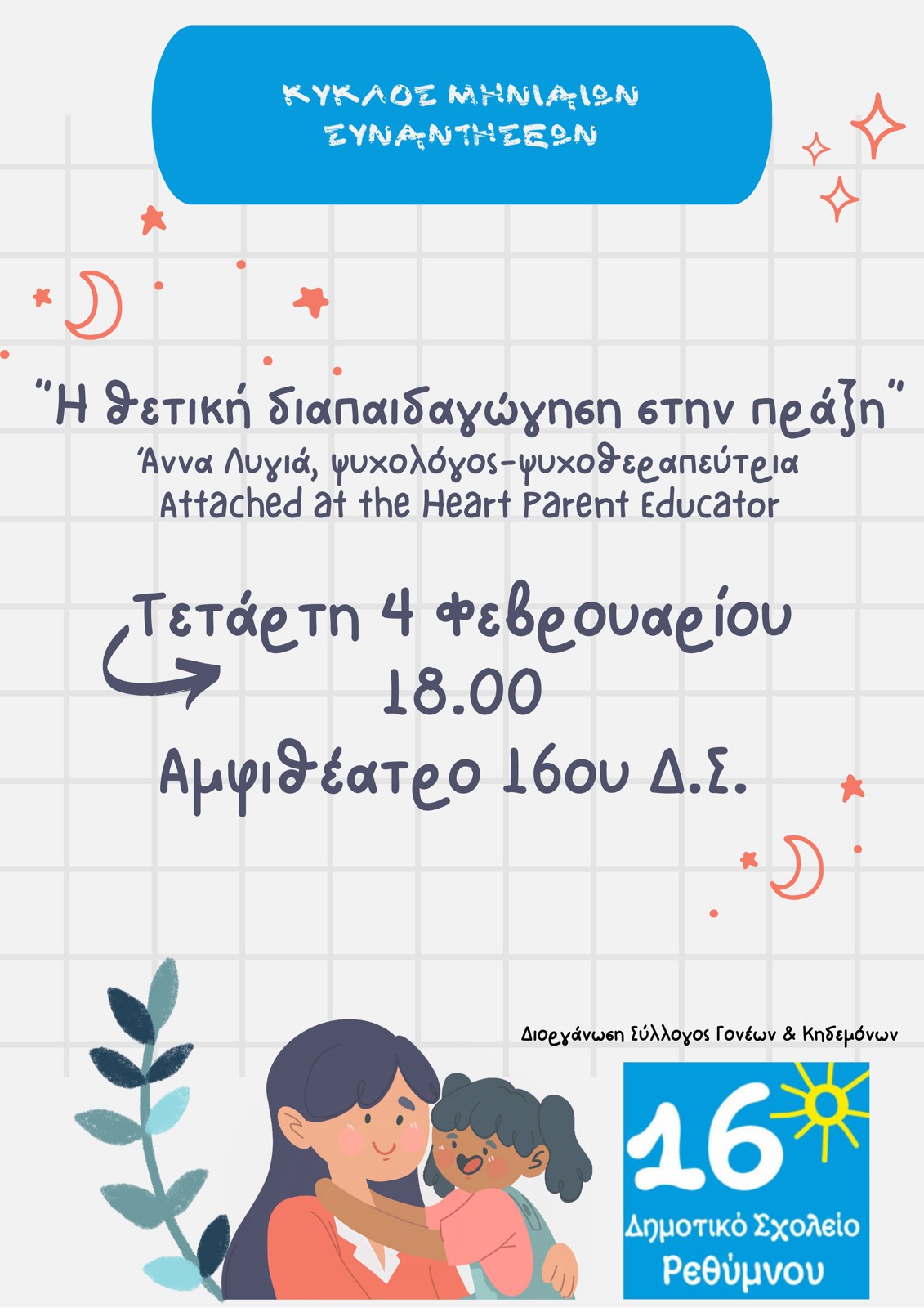 Ο Σύλλογος Γονέων και Κηδεμόνων του 16ου Δημοτικού Σχολείου Ρεθύμνου διοργανώνει έναν κύκλο μηνιαίων συναντήσεων με την ψυχολόγο - ψυχοθεραπεύτρια - Attached at the Heart Parent Educator, κα Άννα Λυγιά.