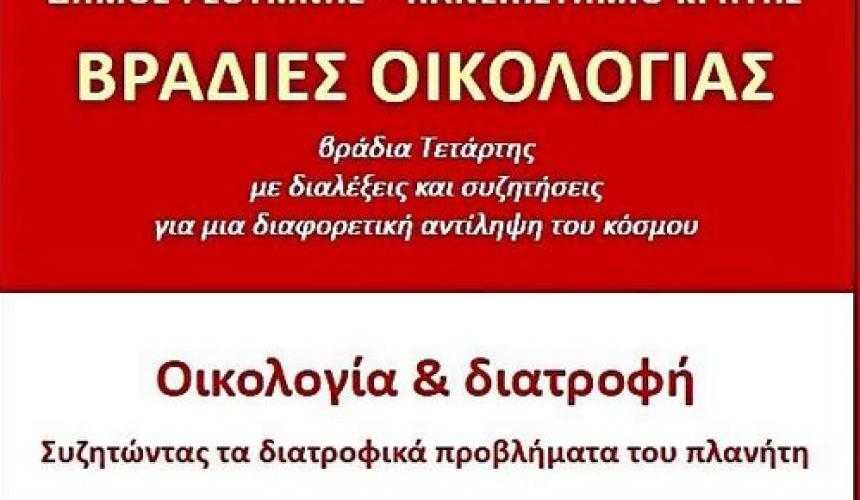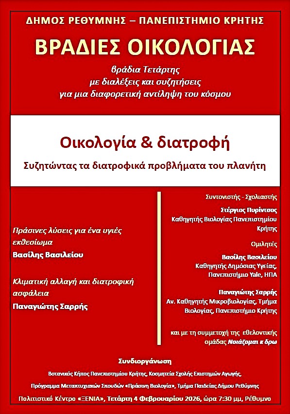 Την προσεχή Τετάρτη 4 Φεβρουαρίου 2026 και ώρα 7:30 μ.μ. στο Πολιτιστικό Κέντρο «ΞΕΝΙΑ» θα συζητηθεί το θέμα «Οικολογία & διατροφή. Συζητώντας τα διατροφικά προβλήματα του πλανήτη».